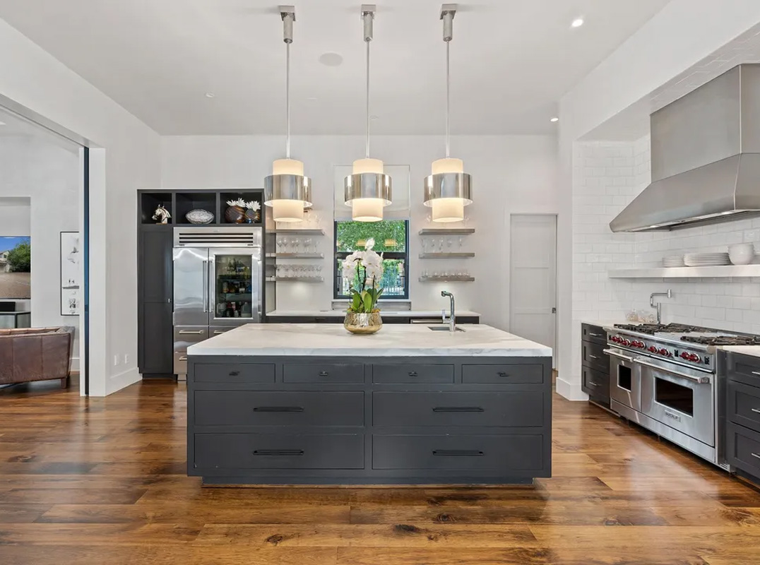 Lastly, the three-car garage has a generous amount of built-in cabinets with black granite countertops. Exquisite craftsmanship, premium materials, and well-considered details make this remarkable property a must-see.
