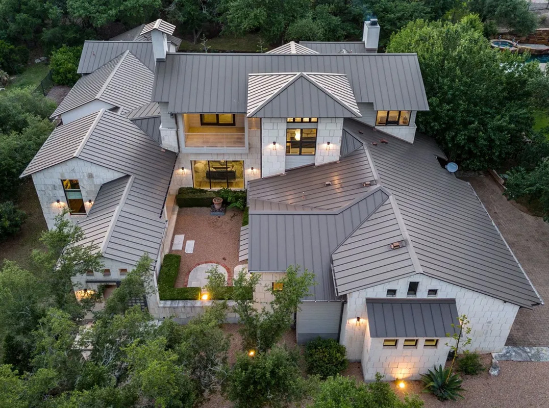 Located on a serene street in the gated neighborhood of Spanish Oaks, this classic Hill Country Zen home radiates a contemporary, yet timeless style. The exterior boasts clean lines with stucco and cut limestone accents. A custom steel gate leads you to the property's courtyard and entry, while steel-framed glass windows and doors showcase the beauty inside.