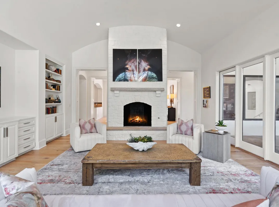 A large stone fireplace anchors the living room, which boasts generous windows framing views of the sprawling oak trees and provides access to the patio.