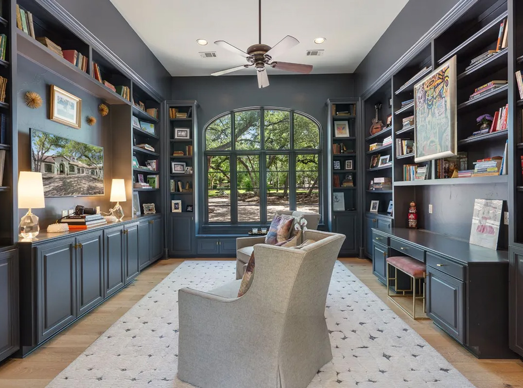 The study offers extensive shelving and picturesque views of the driveway and oak trees, while the dining room, also with scenic views, features a wet bar with a wine refrigerator.