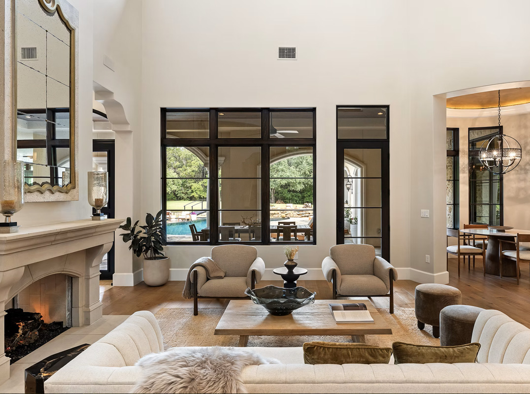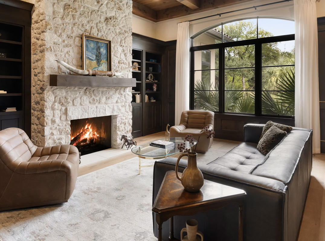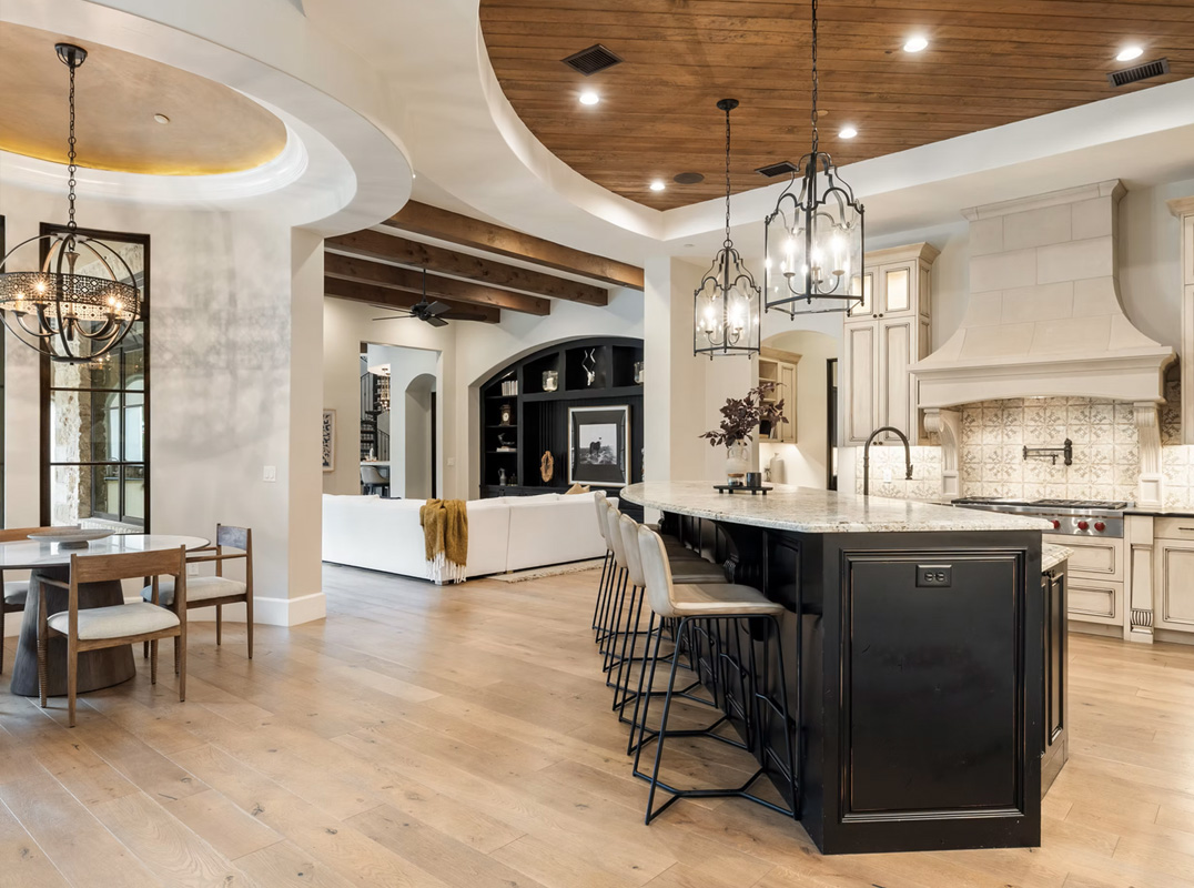 Approaching along the hand-laid paver drive, the setting reads like a prelude: graceful oaks arch overhead, framing an entrance both noble and welcoming. Stepping inside, the floorplan flows with a lyrical rhythm—open spaces balanced by intimate architectural corners and heirloom-quality finishes that nod to timeless craftsmanship. Ceilings become art forms: hand-painted, carved, or shaped to mirror the curves beneath them. The devotion and expert design that shape this home are on display everywhere: from the wide-plank European oak and travertine floors to the meticulously carved wood-domed ceilings to the hand-stuccoed walls and archways that are connected by entire walls of floor-to-ceiling doors and windows at every turn.