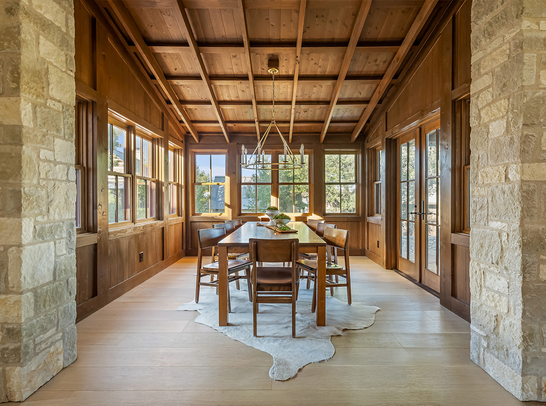 The two-story main gathering house welcomes with generous front and back limestone porches and a soaring great room anchored by a native-stone fireplace. The rustic dining area honors early Fredericksburg construction techniques, with wood walls and exposed ceiling beams adding warmth and authenticity. The open kitchen is both timeless and functional, appointed with premium appliances—including a dual-fuel range with a six-burner gas cooktop, farmhouse sink, and microwave drawer. Nearby, a pantry, spacious laundry room, and separate powder room add convenience and ease for both daily living and entertaining.