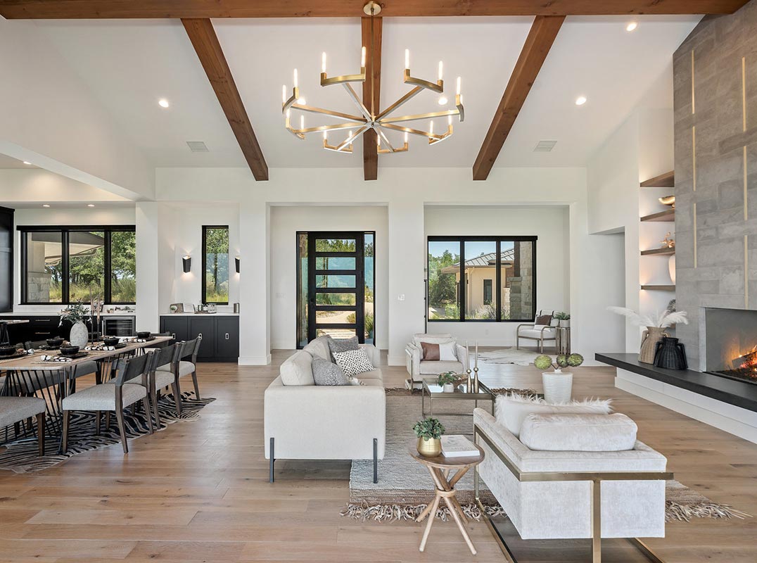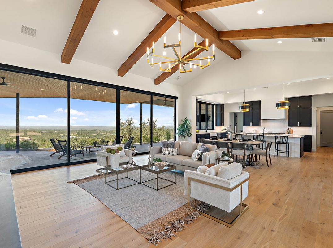Set at the end of a long private driveway, this striking residence is sited to maximize its dramatic vantage point over the rolling hills. Inside, interiors curated by Jennifer Garner Interiors blend bold sophistication with natural elegance, balancing comfort, functionality, and luxury. An expansive open-concept layout offers effortless flow between living, dining, and entertaining spaces, all framed by soaring wood-beamed ceilings and walls of glass that bring the outdoors in.