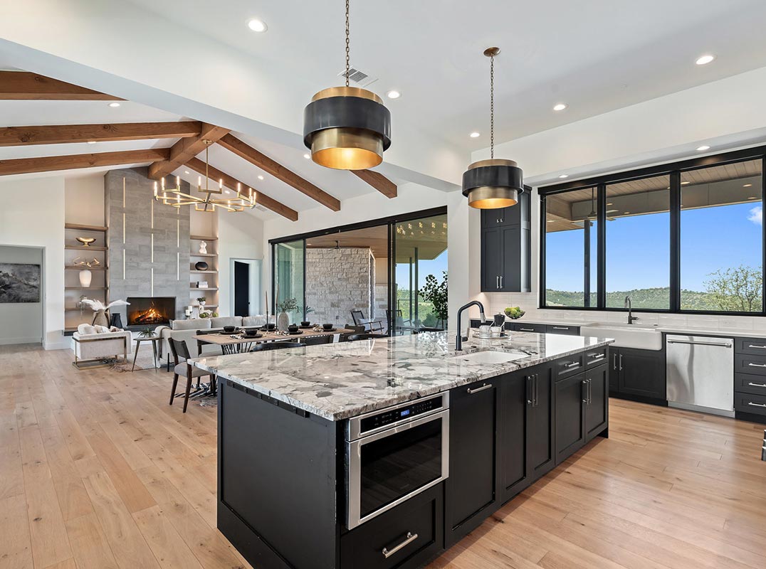 The chef’s kitchen is a true showpiece, featuring Thermador appliances, custom black cabinetry with brass hardware, and a dramatic granite island—all accented by a clean, modern palette. The main-level primary suite is a serene escape with sweeping views, while additional bedrooms, a dedicated office (or optional fifth bedroom), and an upstairs game room with full bath provide ample space for family and guests.