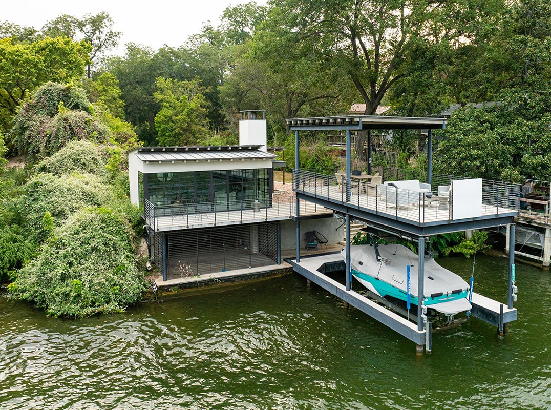 Fantastic waterfront opportunity set on 2.04 acres on Lake Austin. Enjoy the waterfrontage and private views looking out across the lush rolling hills of Emma Long Park. Equidistant to Westlake and Bee Caves, you will have access to all the shopping, dining and entertainment you could want. The level property hosts a modern lakeside bungalow, private boat dock, party deck and comes with two sets of plans to construct a spectacular main residence.
