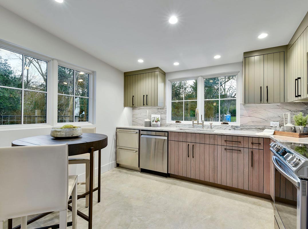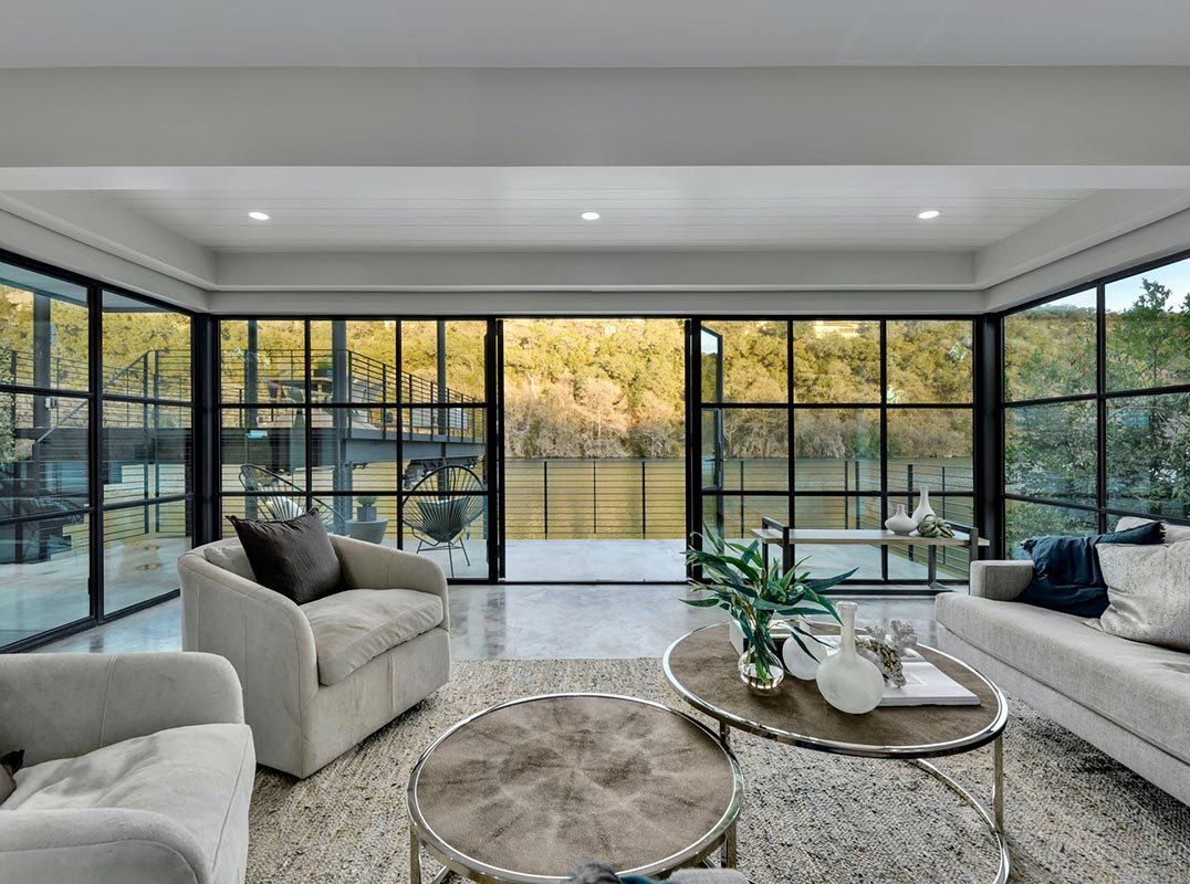 The Ryan Street Architects designed lake cabin is a showpiece on its own, with a wall of steel-framed windows opening up to the water. A huge, two-level shaded deck is cantilevered out over a boat dock and the water. The sleek, modern lake cabin features polished concrete floors, shiplap ceiling accents and fresh white walls so the focus is on the view. The kitchen includes every tool you’ll need to whip up waterside snacks or an elegant alfresco dinner on the patio off the living room. The cabin also includes a large, secured storage space under the dwelling