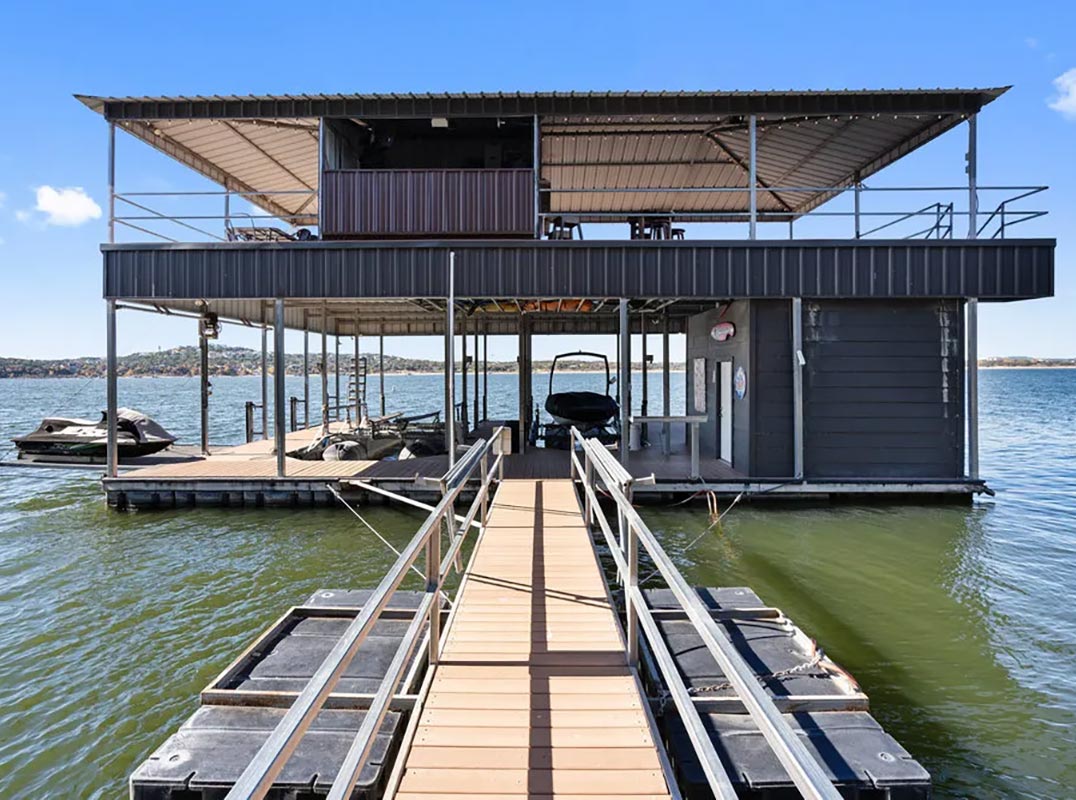 A private funicular, along with a separate staircase, provides seamless access to the impressive oversized two-story boathouse. Designed for full days on the water, the dock features dual boat slips, jet-ski lifts, a mini kitchen, bar, and generous lounging areas—ideal for entertaining, relaxing, and taking in unforgettable Lake Travis sunsets.