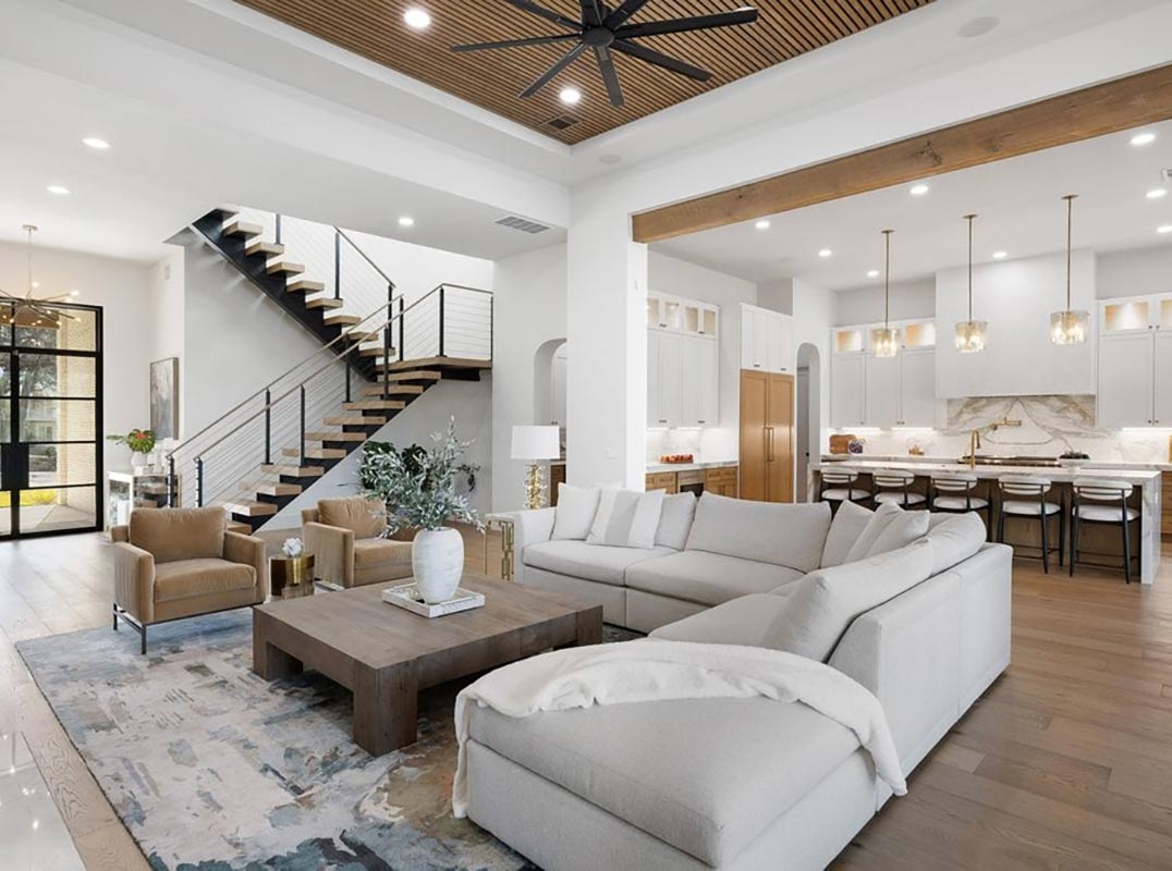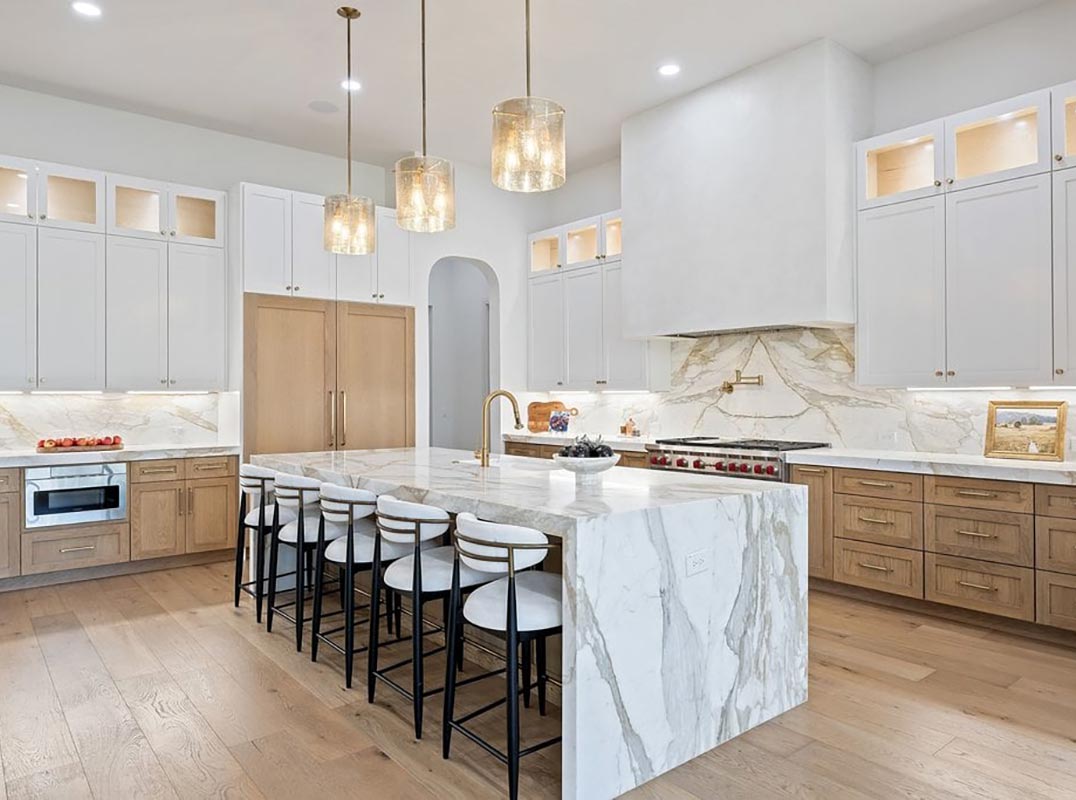 The main living area is both dramatic and inviting, featuring tongue-and-groove ceilings, designer lighting, custom drapery, and a built-in sound system. Stacking glass sliders open fully to the covered patio and pool, creating a seamless indoor-outdoor flow. At the center of the home, the showpiece kitchen is anchored by a statement marble island, dual-tone cabinetry, and integrated Wolf and Sub-Zero appliances. A sleek butler’s pantry—with wine fridge, ice maker, sink, and generous storage—makes entertaining effortless.
