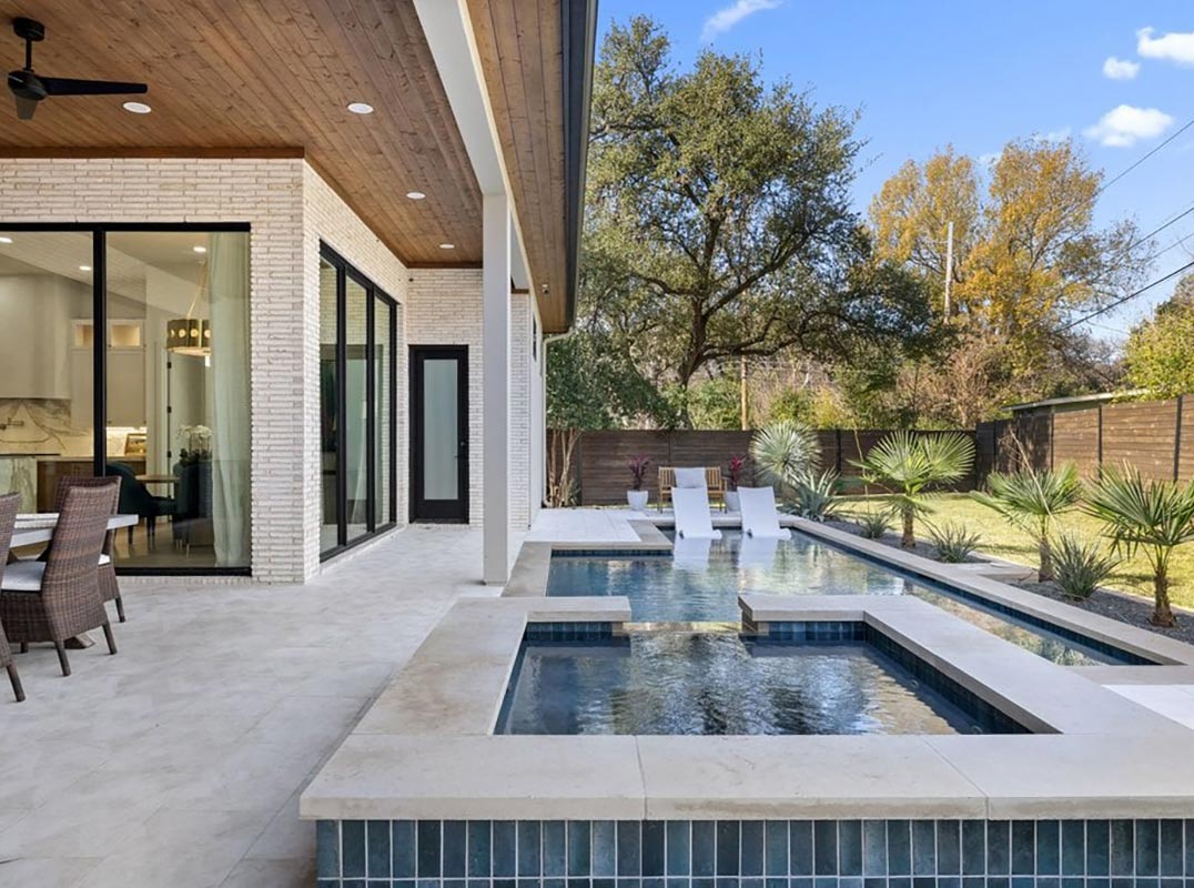Outdoors, a covered patio with dining and lounge areas, full outdoor kitchen, and a perfectly positioned pool and spa invite year-round enjoyment. All of this just minutes from Burnet Road dining, local coffee shops, Downtown Austin, and The Domain—offering the ideal balance of privacy, design, and location.