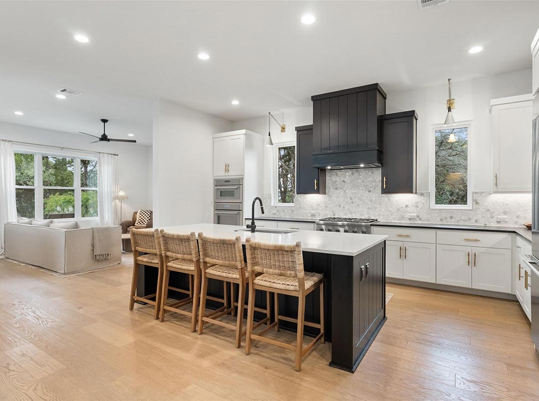 Welcome to a refined retreat in the coveted La Ventana community of Driftwood, where thoughtful architecture, elevated finishes, and natural beauty come together on 1.58 private, tree-filled acres. A long, winding driveway framed by landscaping sets a serene, nature-forward tone and offers exceptional privacy. Inside, natural light fills the open concept living, dining, and kitchen spaces, anchored by a dramatic custom steel and glass full wall window system with an integrated sliding door that creates a seamless indoor outdoor connection. European white oak flooring runs throughout, complemented by custom chandeliers, a statement fireplace with floating shelves, and effortless flow designed for living and entertaining. The chef’s kitchen is a true centerpiece with a quartz-clad island, leathered granite countertops, and Thermador appliances. A dedicated planning room, along with a coffee and beverage bar features quartz counters, built-in storage, and a beverage refrigerator.