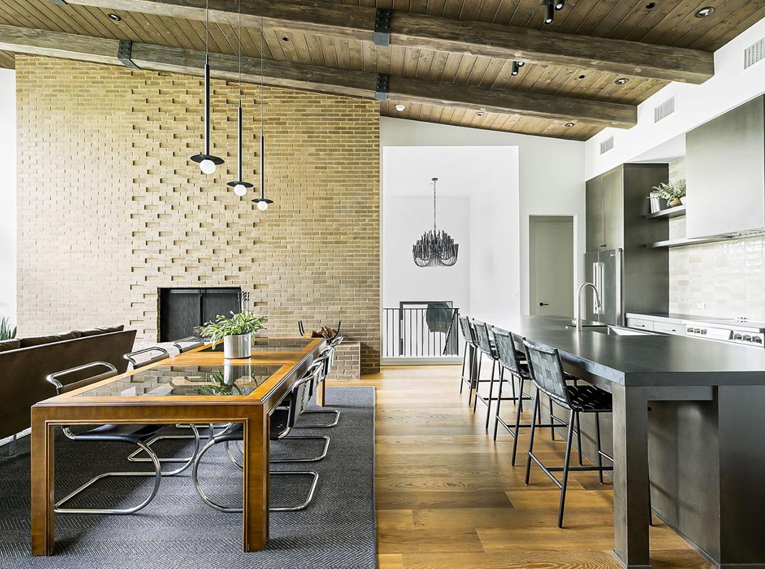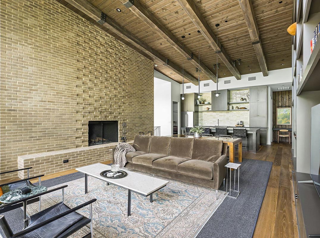 Expansive floor-to-ceiling textured brick fireplace with wall-to-wall brick bench — a true focal point