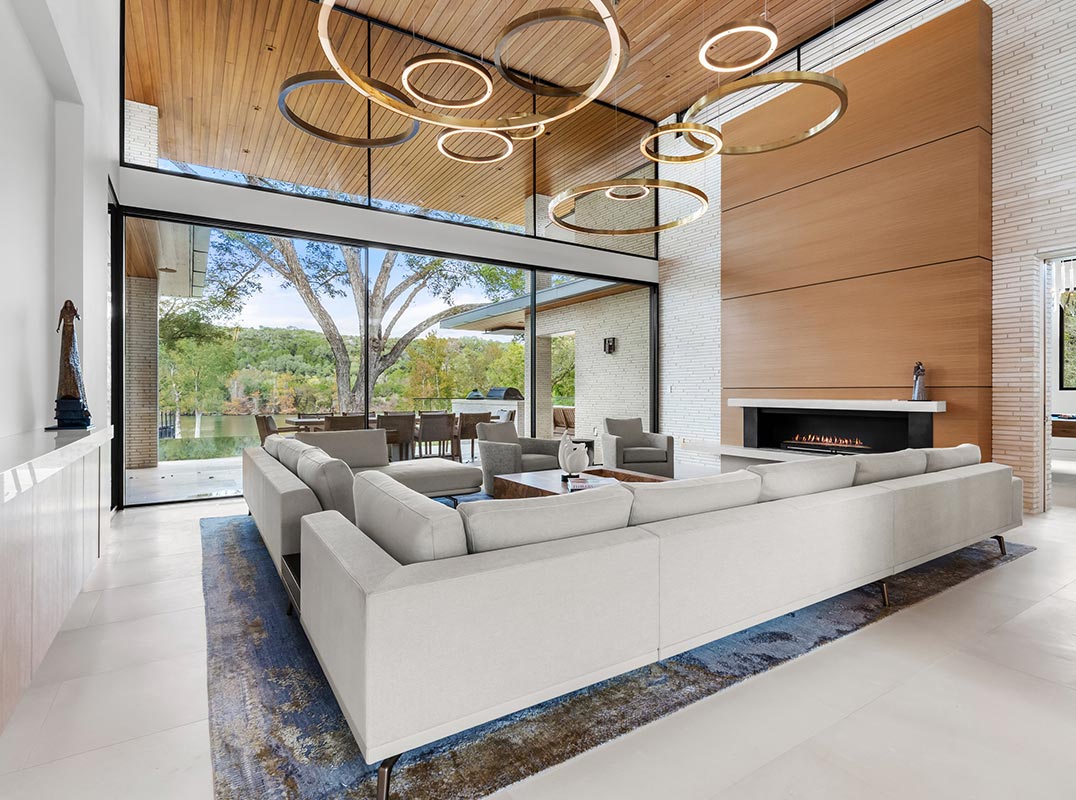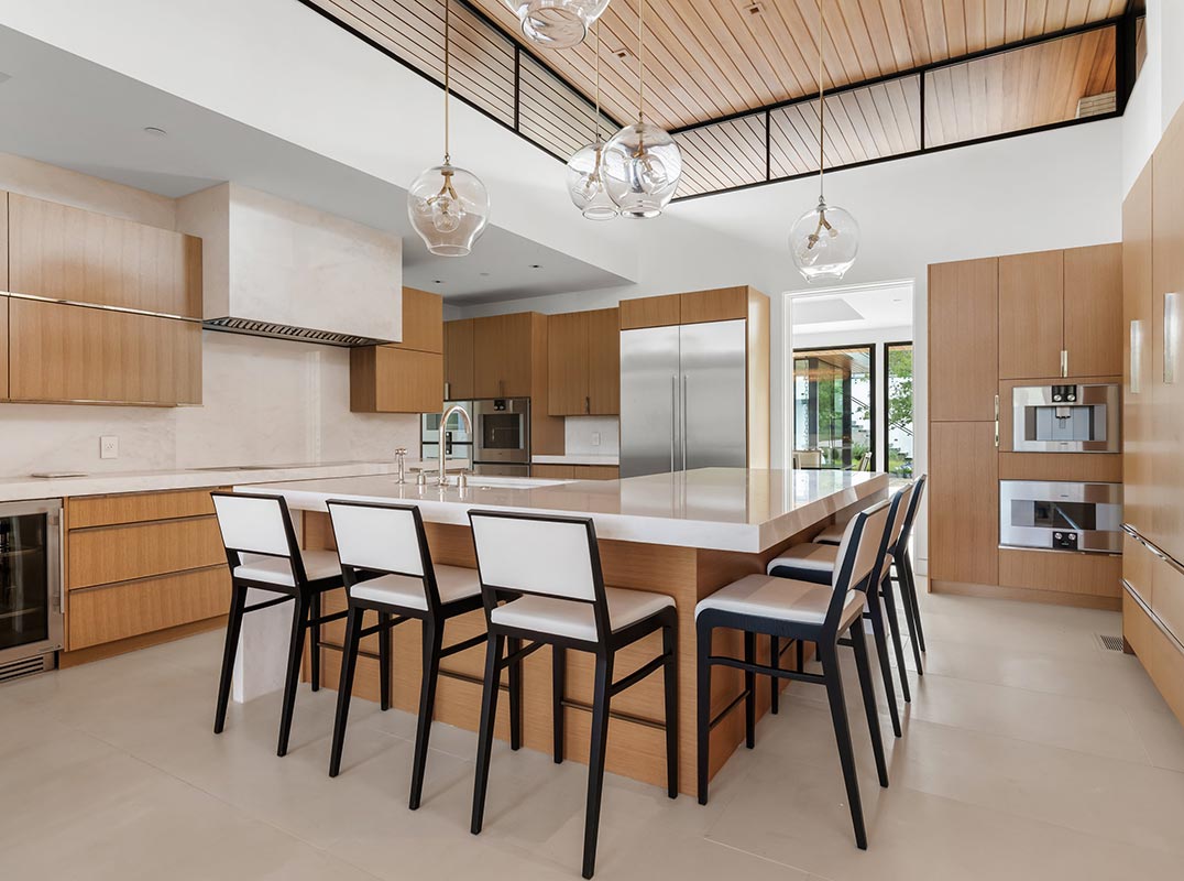 The principal estate is a masterwork of modern design and functionality, offering three bedrooms, three full and three half bathrooms, and a four-car garage. Walls of windows are a pinnacle of the home’s contemporary design. The immaculate chef’s kitchen features Gaggenau appliances, European rift cut white oak cabinetry, and an impressive L-shaped island with seating. The guest house provides an additional one-bedroom, one-and-a-half-bath retreat with a full kitchen, living area, and study, while “The Treehouse” above the detached two-car garage adds another bedroom suite with a balcony and kitchenette. In the main house, plans have been created to convert the secondary office into a bedroom and to add an additional second-floor bedroom over the scullery, allowing the estate to evolve with ease. A private boat dock completes the lakefront offering.