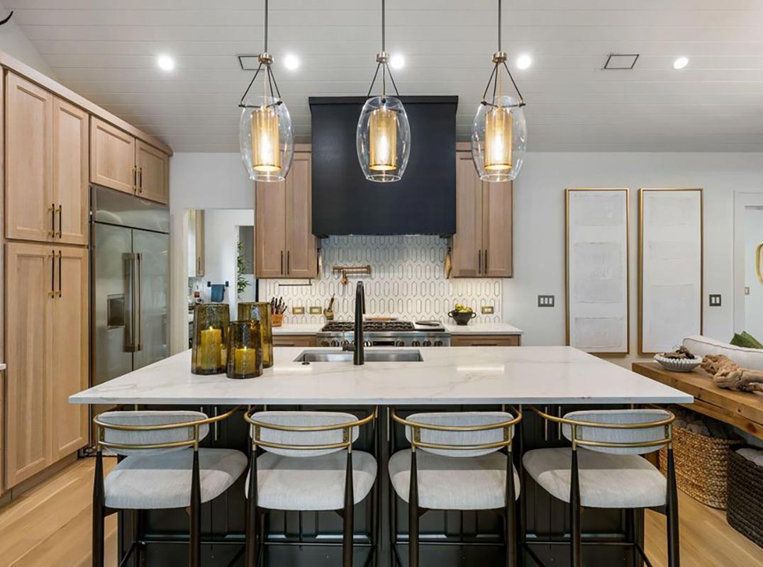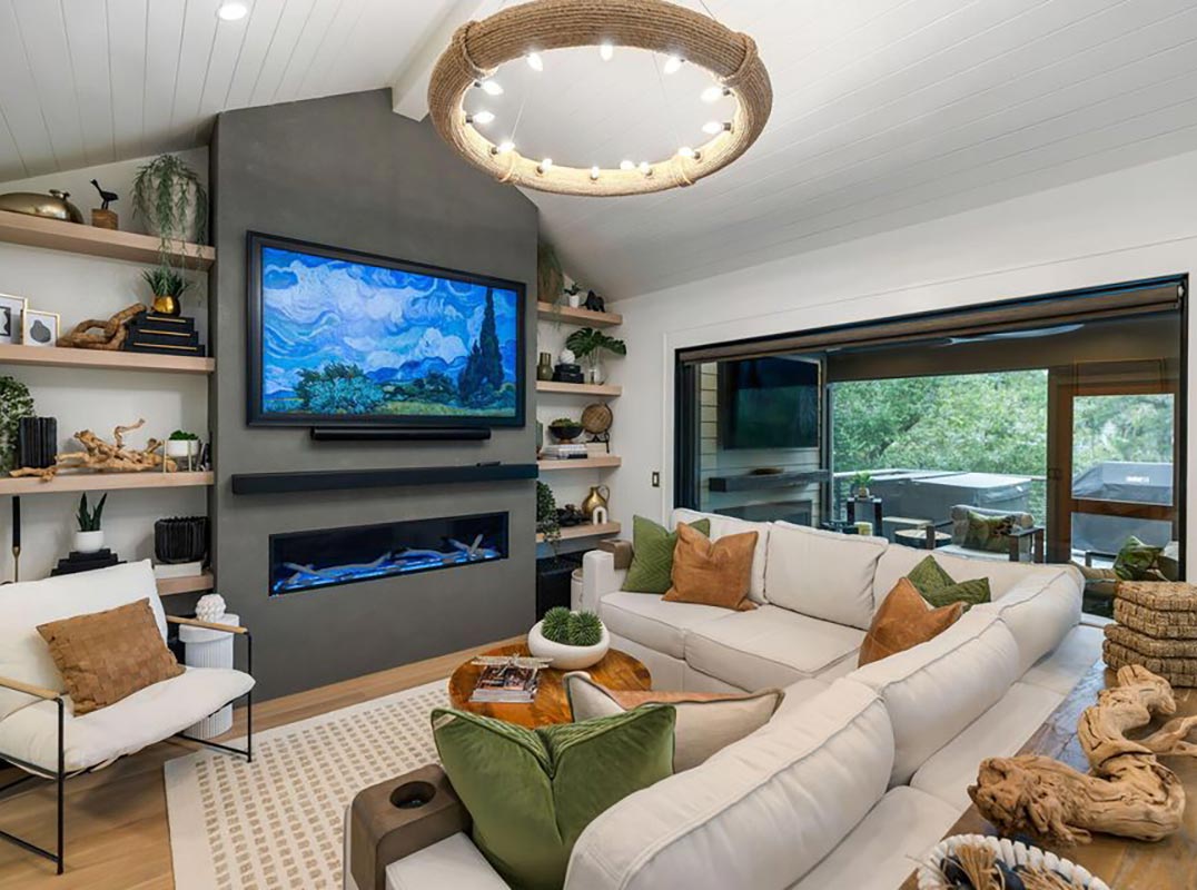 The staircase leading to the second floor is an aesthetic treat with two-story custom trimwork, two stories of windows, and a large modern chandelier. The second floor is the main living area and has a fabulous kitchen and living space overlooking the golf course views. The kitchen and living room have a shiplapped pitched ceiling and stunning light fixtures. The living room has custom cabinetry, white oak open shelving, and a 75" Samsung Frame TV over a modern gas fireplace.