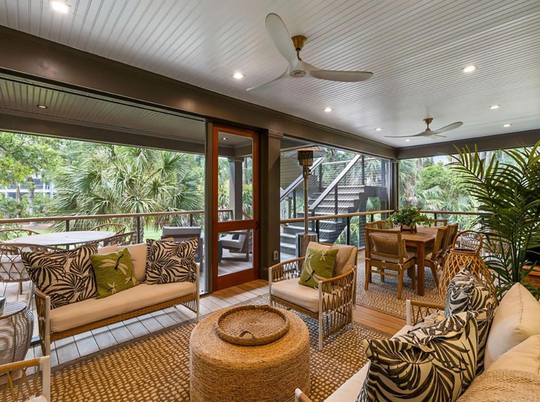 This home has over 1,000 sq feet of outdoor living. Both living floors have their own spectacular porches, both screened and including room for dining and lounging on both levels. The second floor screened porch has a TV, outdoor gas fireplace, dining area, lounging area, and saltwater spa and grilling deck. Both floors of outdoor living feel like extensions of the interior. There are exterior steps from the ground up to the second floor deck and screened porch for easy backyard/golf course access. The garage is fully enclosed and has epoxy floors, flood vents, and is dehumidified for the best storage. Having the garage enclosed and dehumidified, as well as the first floor system and attic space spray foamed, keeps this home super tight and protected from the lowcountry humidity. This home is beautifully designed and furnished. All furnishings to convey, excluding artwork and personal items of the Sellers. See attached Exclusions List. Six-seater Bintelli LSV can also convey.