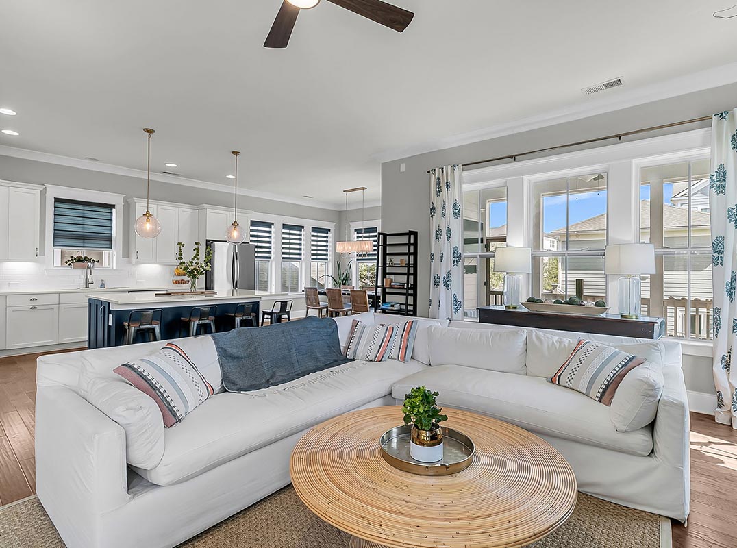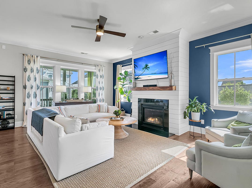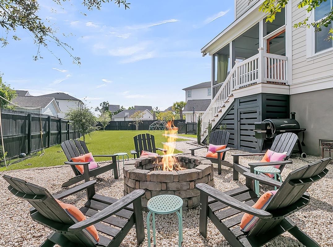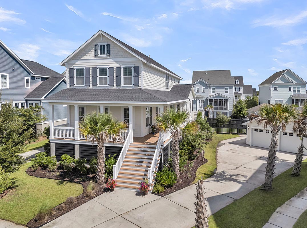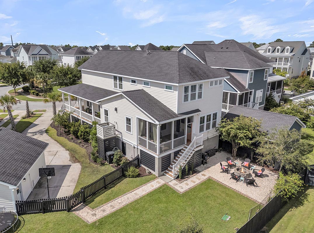 A charming Daniel Island South home with wrap around front porch, open floor plan and impressive backyard with fire pit and room for a pool - perfect for your indoor/outdoor Lowcountry lifestyle. Filled with natural light, the first floor offers spacious kitchen with large island, walk in pantry, family room with shiplap details and gas fireplace, convenient first floor guest room with full bath, plus home office with french doors.