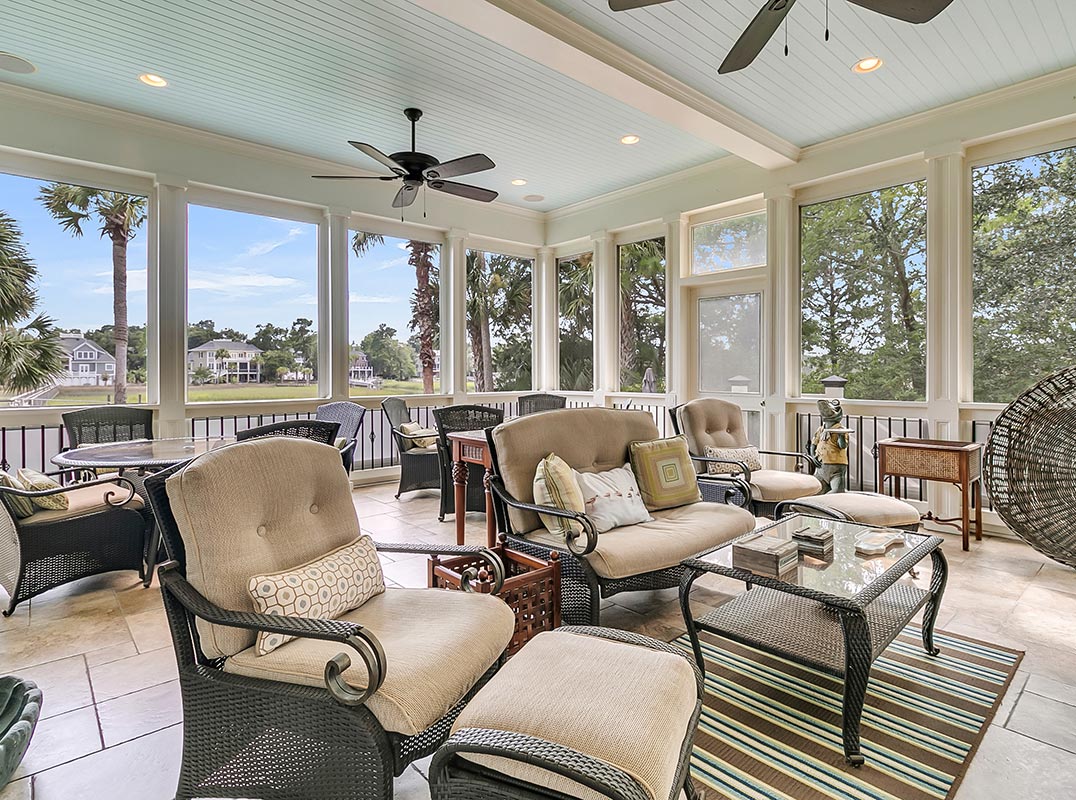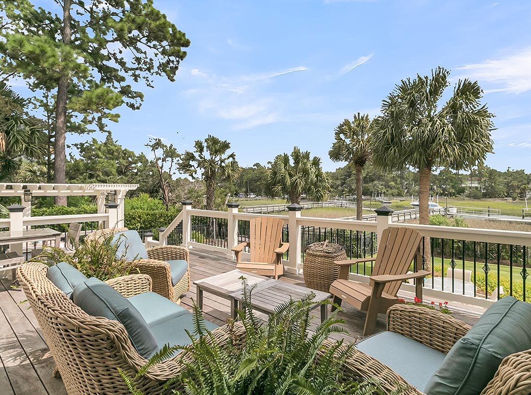 The backyard is an outdoor oasis complete with a saltwater pool, several seating & lounging areas, (including patio and deck space), an outdoor shower, and an outdoor kitchen - all overlooking the creek and marsh. The fenced in yard is perfect for your four legged friends.