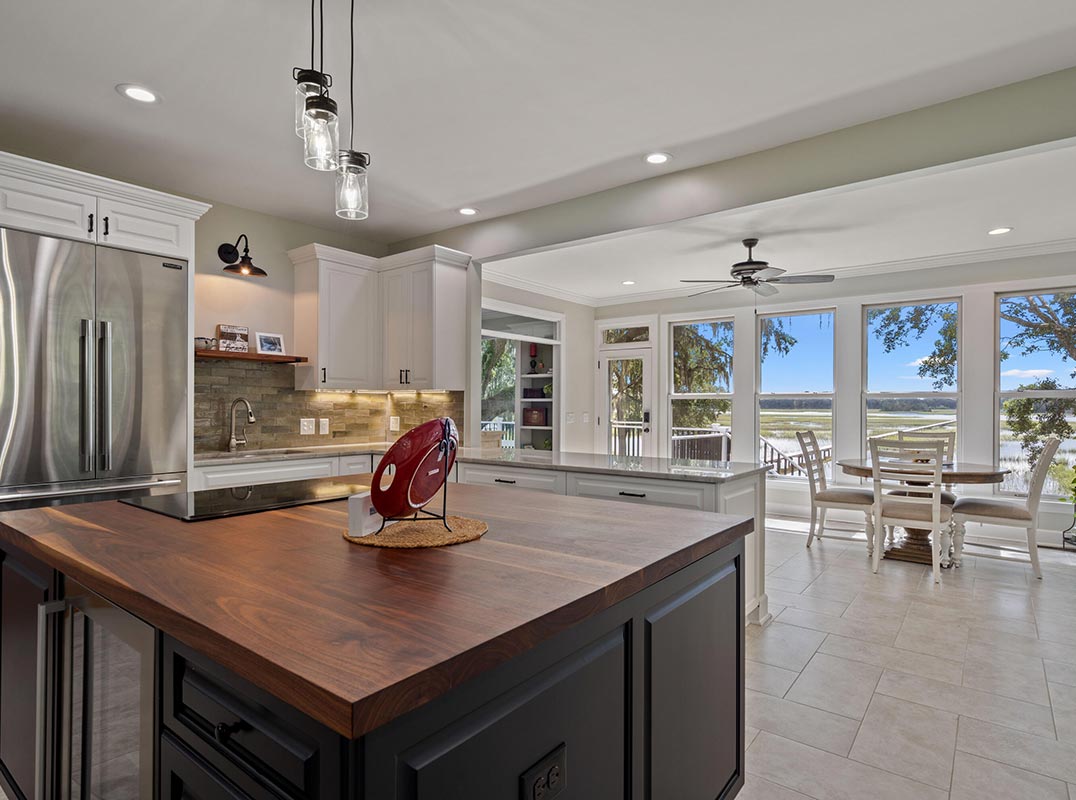 The four-bedroom, three-and-a-half-bath residence exudes timeless Southern charm and has been meticulously maintained. From the moment you step through the custom Sapele mahogany doors, you are greeted by sweeping views that create an immediate sense of calm and connection to the water.The home's interior blends classic craftsmanship with modern updates, highlighted by a recently renovated kitchen designed for both beauty and function. Thoughtfully reimagined with an open concept, the kitchen now captures abundant natural light and uninterrupted views, featuring custom maple cabinetry with red oak shelving, walnut countertops on the island, quartz countertops along the perimeter, Signature stainless steel appliances, a built-in beverage cooler, and a custom coffee bar. The breakfast nook, framed by windows and French doors, opens onto the back porch where you can enjoy morning coffee while overlooking the tranquil waterway.