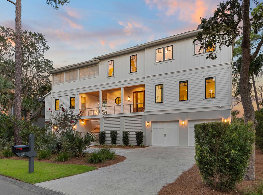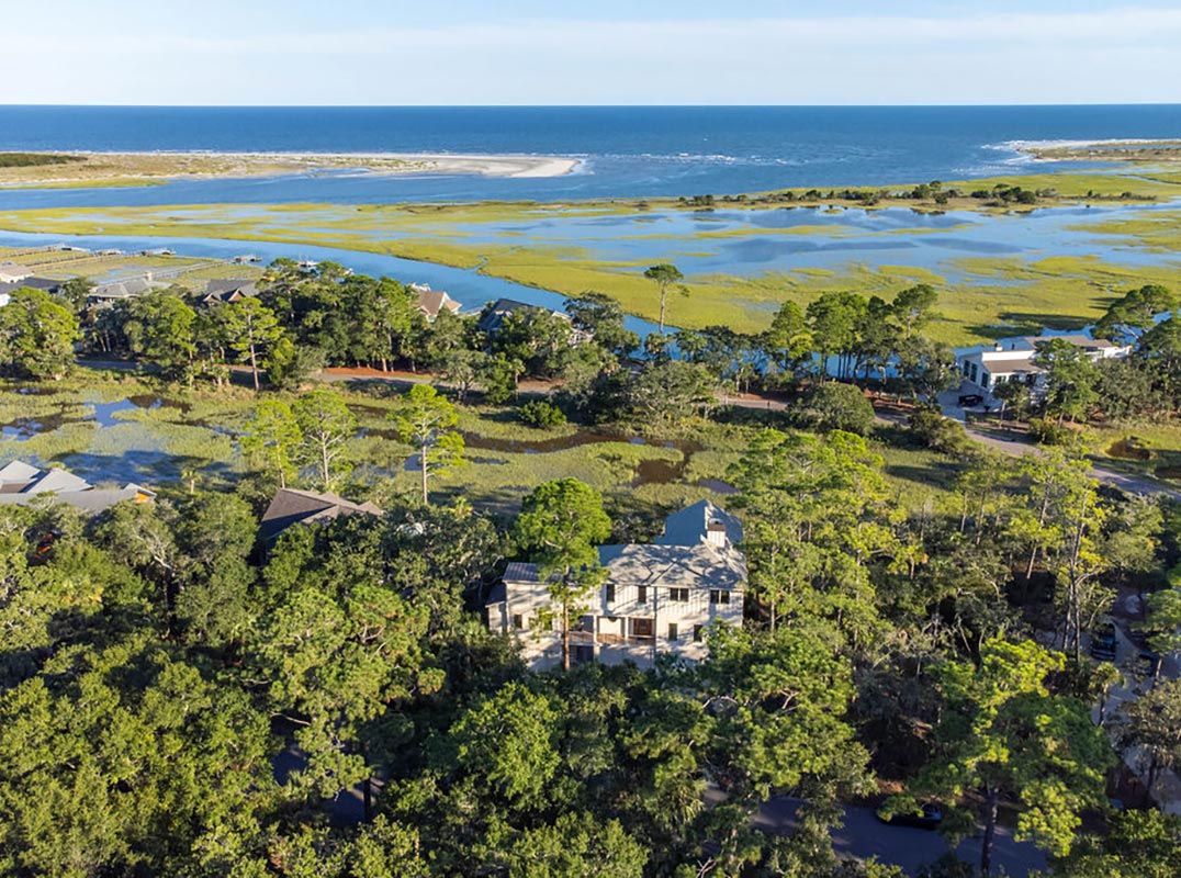 Custom built in 2023, this coastal modern 5-bedroom, 5 bath (4 ensuite) home is an elevated construction with reverse floorplan, designed to maximize the magnificent, wide-open views and breezes of the marsh, Kiawah River, and the Atlantic Ocean.