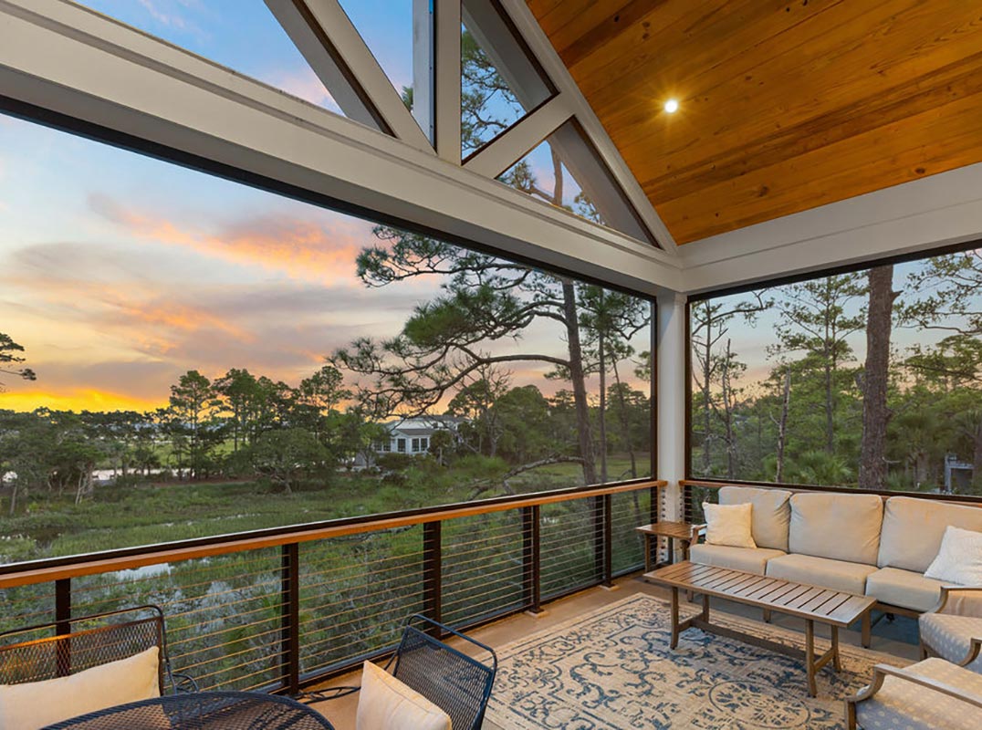 Upstairs, the open concept is ideal for cooking and entertaining many guests. The generous chef's kitchen features an impressive center island topped with gorgeous Bianco Rhino honed marble. Tasteful custom cabinetry, stainless steel Fisher Paykel appliances and upscale hardware and finishes create a sophisticated and functional space that's open to dining and living room. A gas fireplace with shiplap details anchors the living space, but the true highlight is the over-sized, pitched-ceiling screened porch that sits high above the marsh, capturing the magical beauty of this prime location. Tucked away on this floor is the fifth bedroom which shares a full bath located in the hallway behind the fireplace. This room would also be a perfect office or den. Not to be overlooked, a grill deck with space for dining table and additional seating is located off the kitchen, adding yet another vantage point for enjoying the scenery and wildlife.