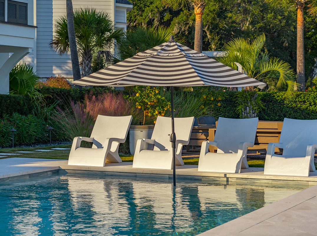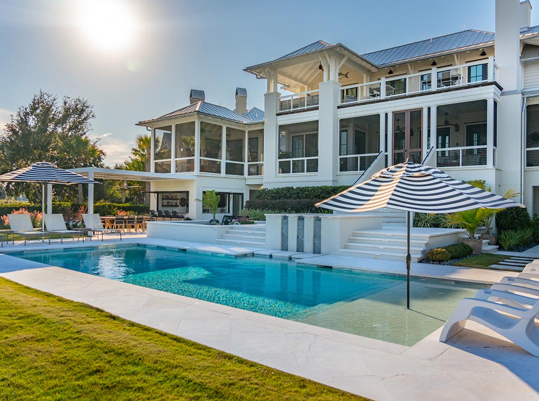 The chef's kitchen pairs form and function with a grand island, professional-grade appliances, and seamless flow to the dining area, bar, and temperature-controlled glass wine room, a design centerpiece for both everyday indulgence and unforgettable entertaining. But it's the outdoor experience that truly redefines this property, a breathtaking transformation that evokes Ritz-Carlton meets Daniel Island. The backyard is an architectural landscape masterpiece, anchored by a resort-style pool that glows under the Charleston sky and surrounded by a massive putting green, fire pit lounge, and a custom pergola with a motorized louvered roof system.