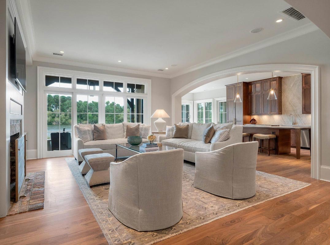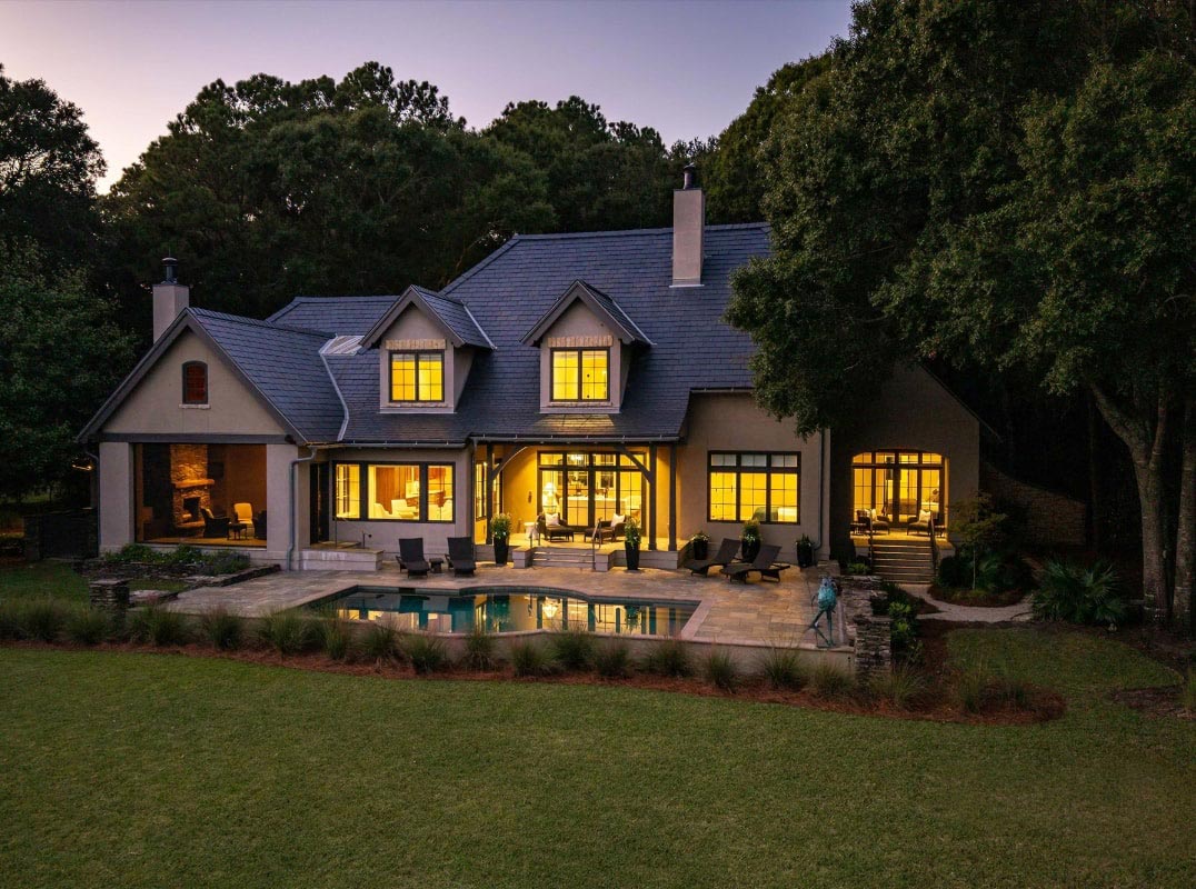 Set on 4.09 acres, the residence, along with its meticulously designed landscapes and hardscapes, has been fully transformed into a light-filled retreat where timeless Lowcountry charm meets modern sophistication. Expansive interiors open seamlessly to porches overlooking butterfly gardens, sweeping lake views, and a saltwater pool that shimmers in the evening light.