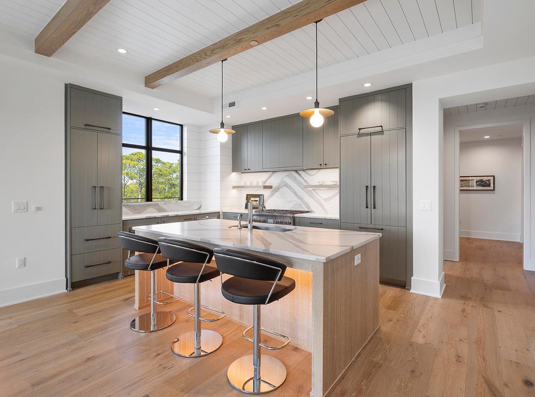 The panoramic living room windows showcase Kiawah Island's remarkable coastal beauty, while the open concept layout is ideal for both everyday living and entertaining. Interior features include engineered hardwood floors throughout, beamed ceilings with shiplap accents in the living room, and thoughtful architectural details at every turn. The chef's kitchen centers around a large island withilluminated bar seating and is equipped with a premium Thermador appliance package, including a six burner gas range, wine refrigerator, and Scotsman ice maker. Custom cabinetry conceals the appliances, perfectly complementing the striking quartz countertops and backsplash.