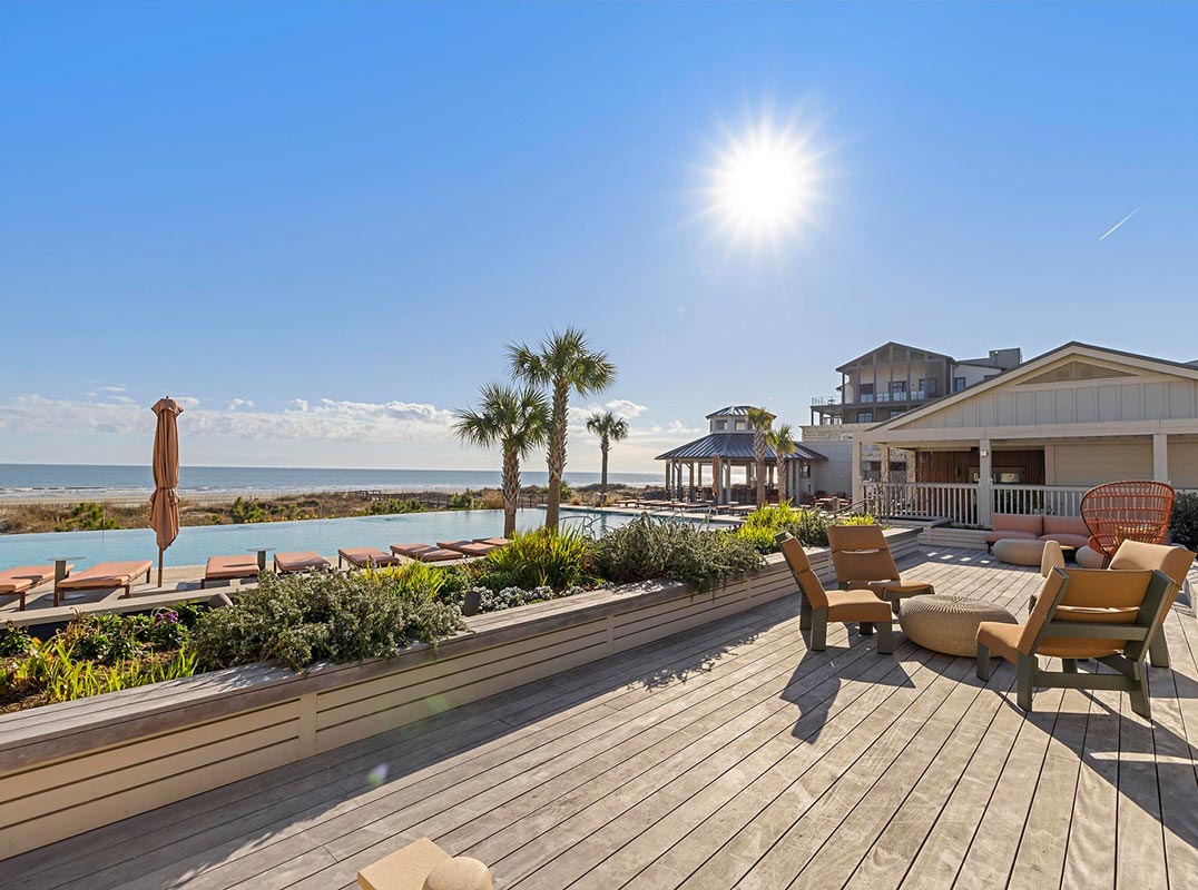 A spacious outdoor terrace connects the living room, and guest bedroom/office. The terrace features IPE decking, glass safety panels, and is the perfect setting to enjoy spectacular sunsets and uninterrupted views of the turtle nesting wildlife preserve. The expansive primary suite offers tranquil western-facing views of the Kiawah River. The primary bathroom is accessed through a generous walk-in closet with custom built-ins. The spa-like primary bathroom features elegant tile flooring, a custom vanity with designer mirrors and lighting, Waterworks fixtures, and a Victoria + Albert soaking tub thoughtfully positioned to take in the scenery. The oversized shower has been upgraded with bamboo-style tile and enhanced lighting. A guest bedroom with a full bath and tub/shower combination provides comfortable accommodations, while the third bedroom featuring built-in closet storage and deck access offers flexibility as an office, bunk room, or additional guest space.