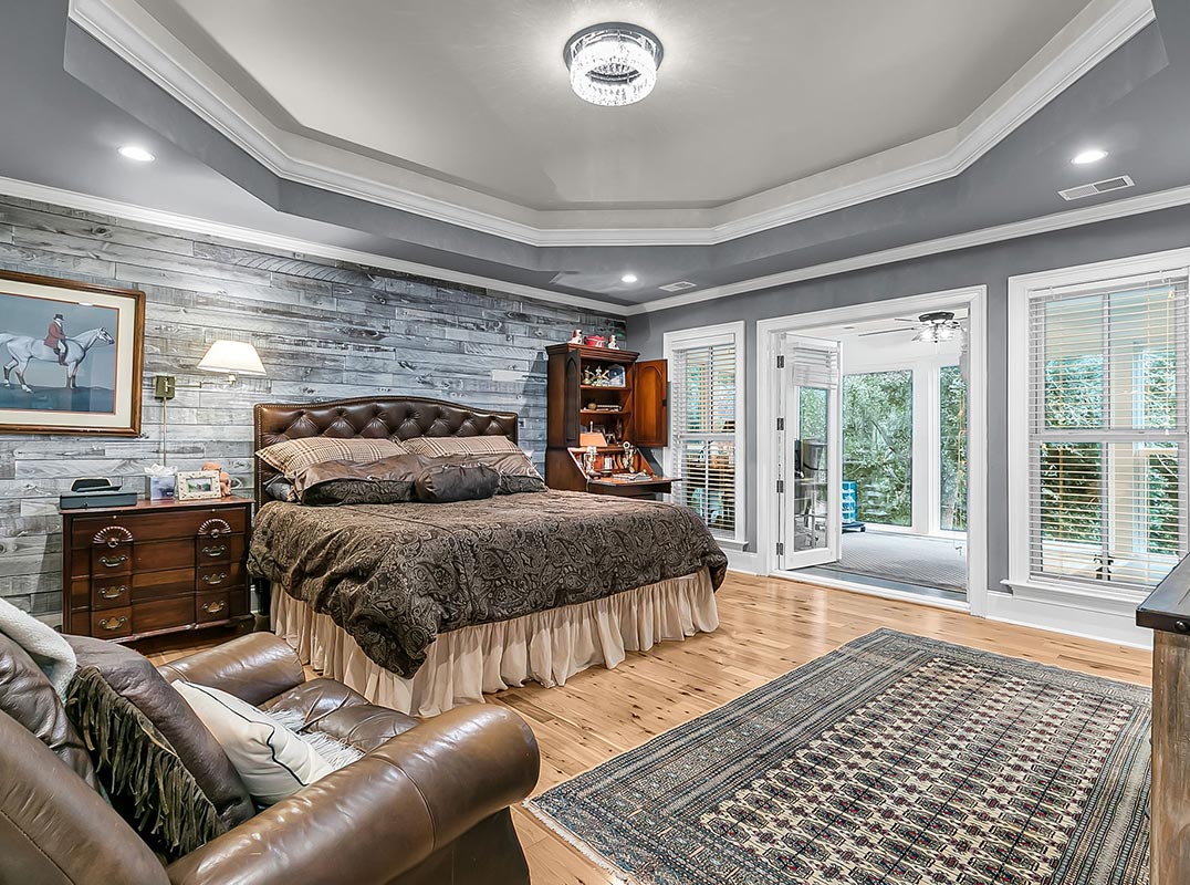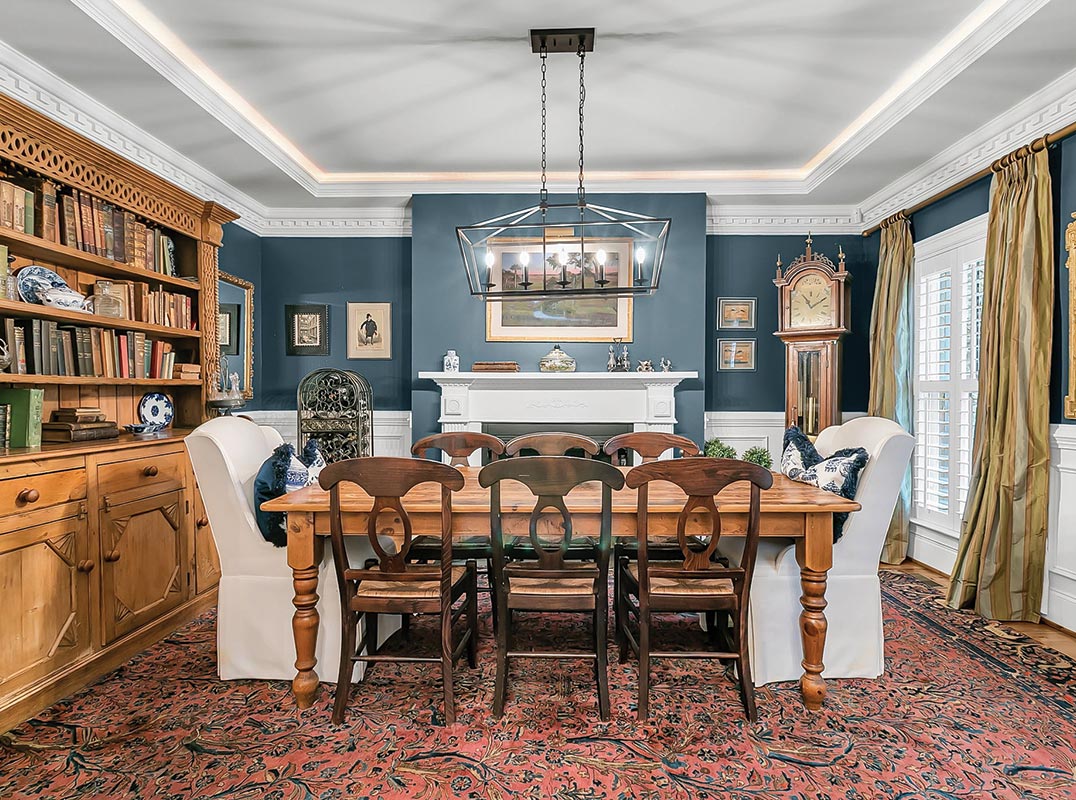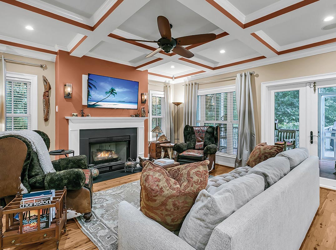 Thoughtfully designed and graciously appointed, you will appreciate every detail of this home.Front steps adorned with Fig ivy lead you to a center portico with stately columns, gas lanterns and haint blue ceiling. Grand double entry doors welcome you to a residence that perfectly balances sophisticated design and Southern charm. Just off the foyer you will find the formal dining room and a study, each with gas fireplace. Cypress hardwood floors, coffered and floating tray ceilings, wainscoting, and dentil molding, add architectural distinction.