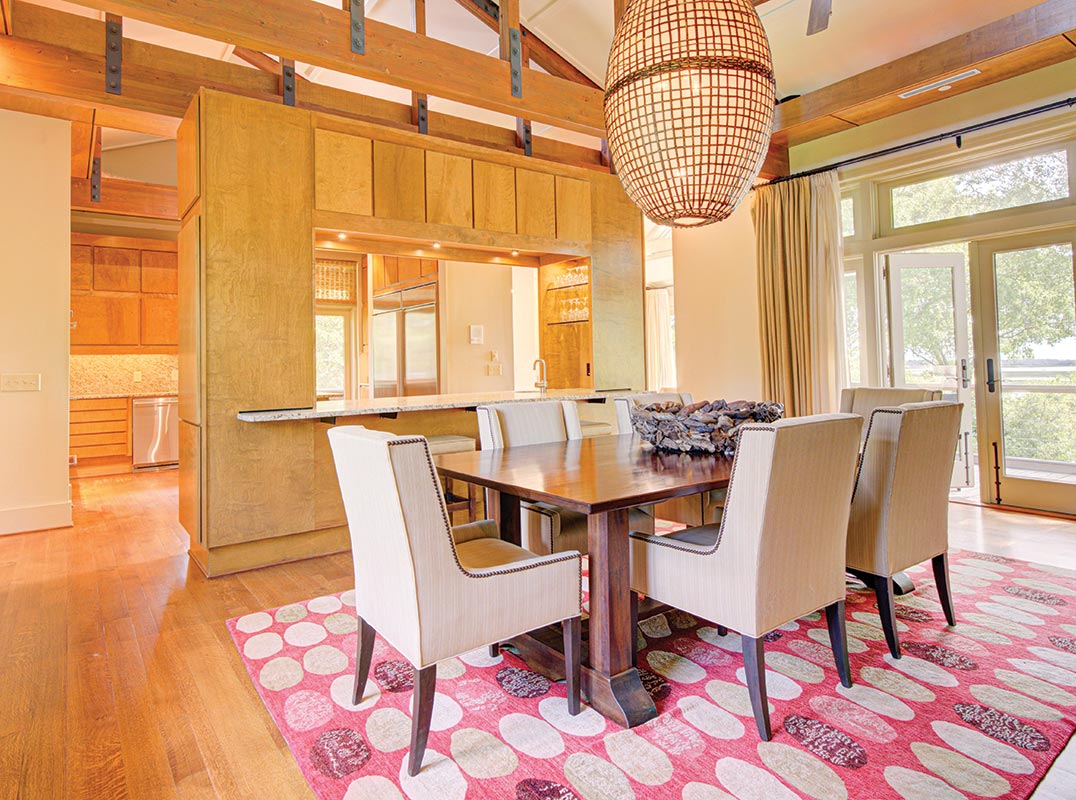 The home is equipped with hurricane-rated windows from Andersen Windows, complemented by elegant UV-protective sheer shades by Hunter Douglas that reduce ultraviolet rays by up to ninety percent while allowing soft natural light to illuminate the interiors. Architectural elements such as the home's sleek profile and deep roof overhangs promote natural cross-ventilation in all weather conditions, while the classic Charleston-style piazza provides shaded outdoor living and a seamless connection to the surrounding landscape.