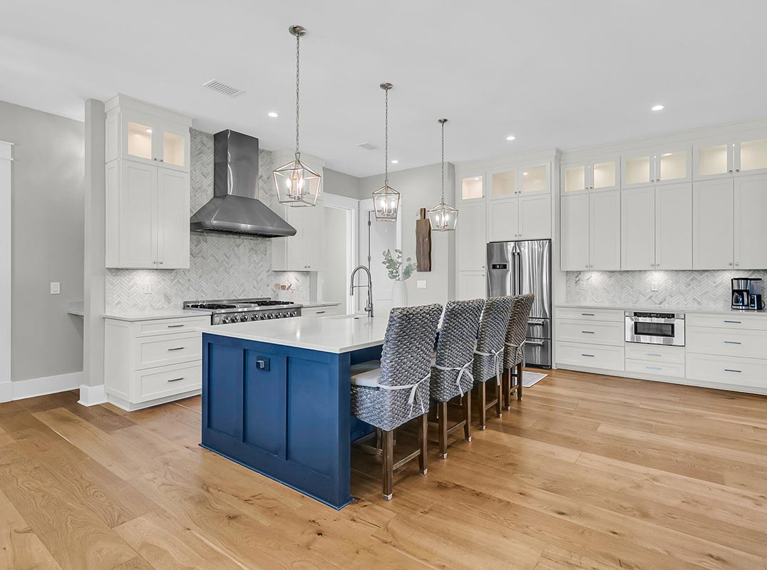 Stepping onto the expansive charming front porch with Haint blue ceiling, you are greeted by majestic mahogany double doors. Inside, discover expansive natural white oak flooring beneath 10' ceilings. The comfortable living room, featuring a gas fireplace with a brick and shiplap backdrop and custom-built shelving, flows seamlessly into the outdoor living space through grand sliding doors.( The heart of the home is the spacious kitchen, featuring a gorgeous, quartz-topped island, state-of-the-art appliances, and custom cabinetry. Adjacent is a dining area perfect for both lively gatherings and intimate meals. Not to be missed is the luxurious first-floor primary suite - an oasis with direct access to the back porch, where mornings are best started poolside. The accompanying ensuite, with floor to ceiling Carrera marble tiled walls, boasts an inviting soaking tub, and a luxurious oversized shower w/seamless glass doors and rain shower, dual sink vanity w/quartz countertop, sleek black hardware, and designer mirrors, lighting and floor tiles. There is also a spacious walk-in closet w/custom shelving. Rounding out the first floor is a powder room, and a laundry/mud room with designer floor tiles, built-in bench and storage area, deep utility sink and GE washer and dryer.