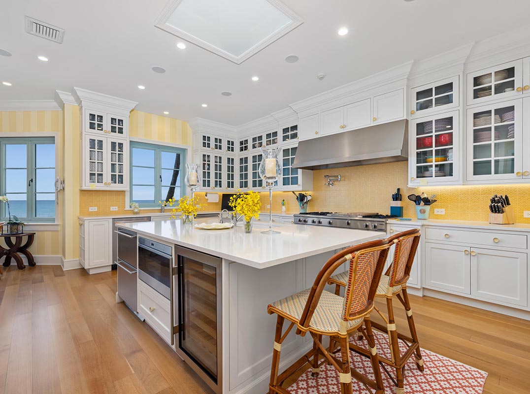 The chef's kitchen, elegant dining room overlooking the Atlantic, refined living areas, and private office all anchor the main living level.