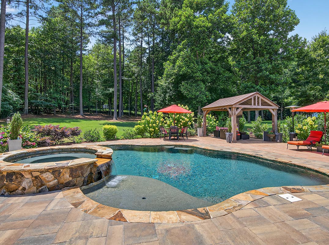 Welcome Home! This exceptional 4-bedroom, 3.5-bath custom home is nestled on a lush, wooded lot with tranquil waterviews. The spacious main-level primary suite provides convenience and serenity, while the upgraded bathrooms and kitchen reflect quality craftsmanship and attention to detail. Gorgeous board and batten finishes add character throughout while the gas log fireplaces create a warm, inviting atmosphere. Step outside to your private backyard oasis—complete with a saltwater gunite pool, spa, fireplace and mature landscaping for year-round beauty and seclusion. A generous 3-car garage provides ample storage and functionality. Located in a private neighborhood known for its large lots and beautiful custom homes, this property offers the rare combination of peaceful surroundings with walking trail, and upscale living. Conveniently located near The Villages of Sherrills Ford for your shopping needs, schools, and public boat storage nearby. New roof 2023! A one-of-a-kind retreat!