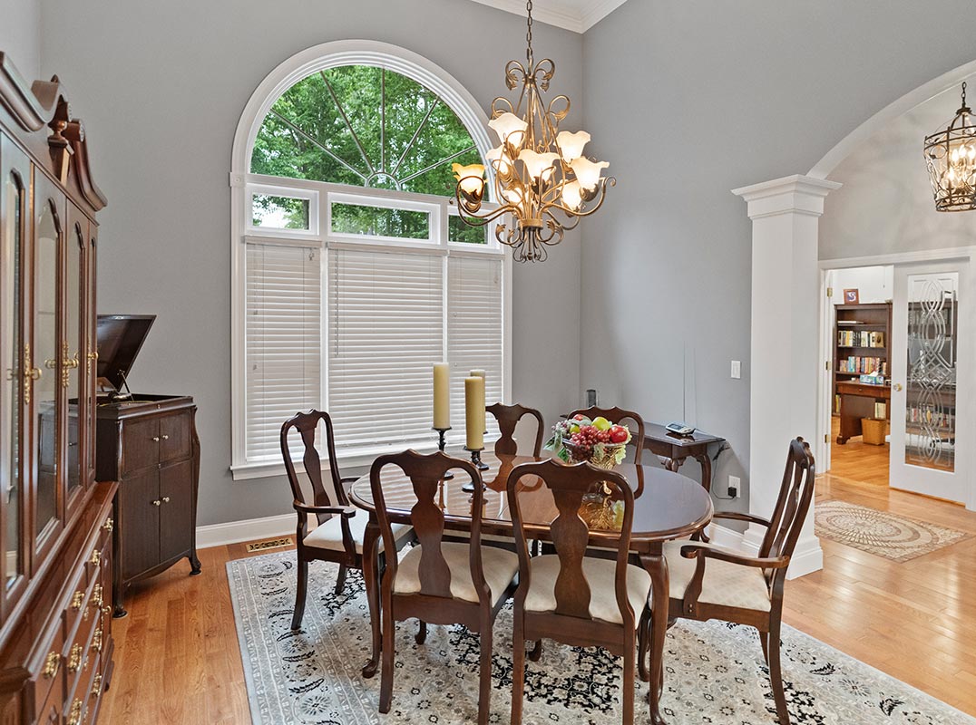 The heart of the home is the gourmet kitchen, featuring custom cabinetry, granite countertops, high-end appliances, and a spacious island with pendant lighting. A tiled backsplash adds a touch of artistry, while the adjoining breakfast nook, surrounded by arched windows, offers peaceful views of the private lot.