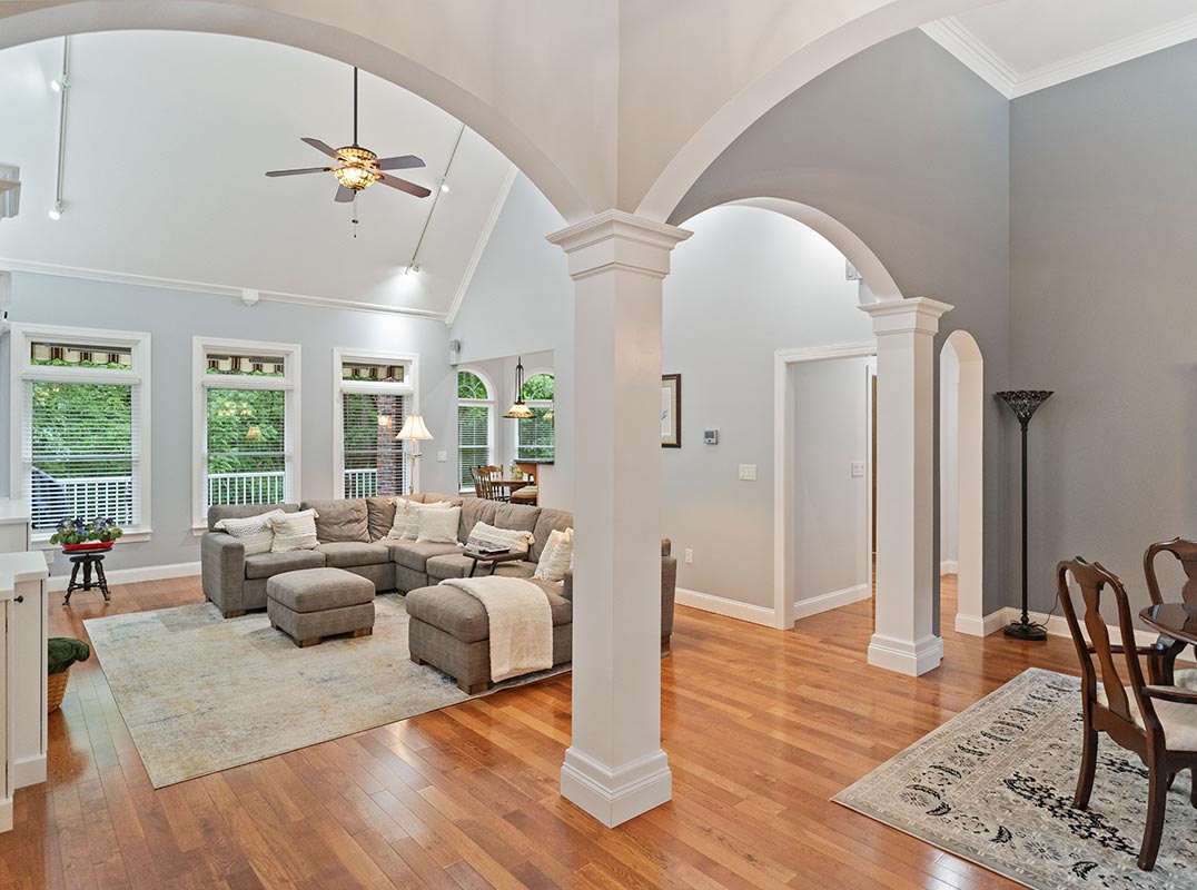Step through the front door into an airy, open layout highlighted by soaring ceilings, warm hardwood floors, and expansive windows that bathe the home in natural light. The two-story great room is both elegant and inviting, centered around a cozy fireplace with custom built-ins and framed by arched architectural details. Just beyond, the home flows seamlessly into a large study and formal dining space, making it ideal for entertaining or working from home.