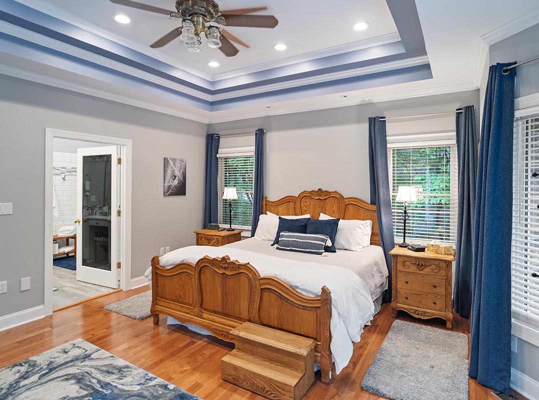 The main-level primary suite is a retreat of its own with a tray ceiling design, hardwood floors, and spa-like bath. Double vanities, a walk-in shower, and soaking tub create the perfect space to unwind, while dual closets ensure ample storage.