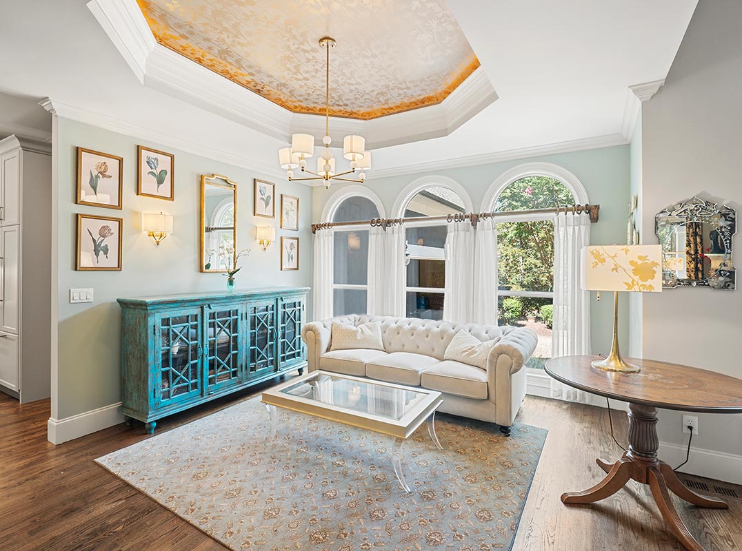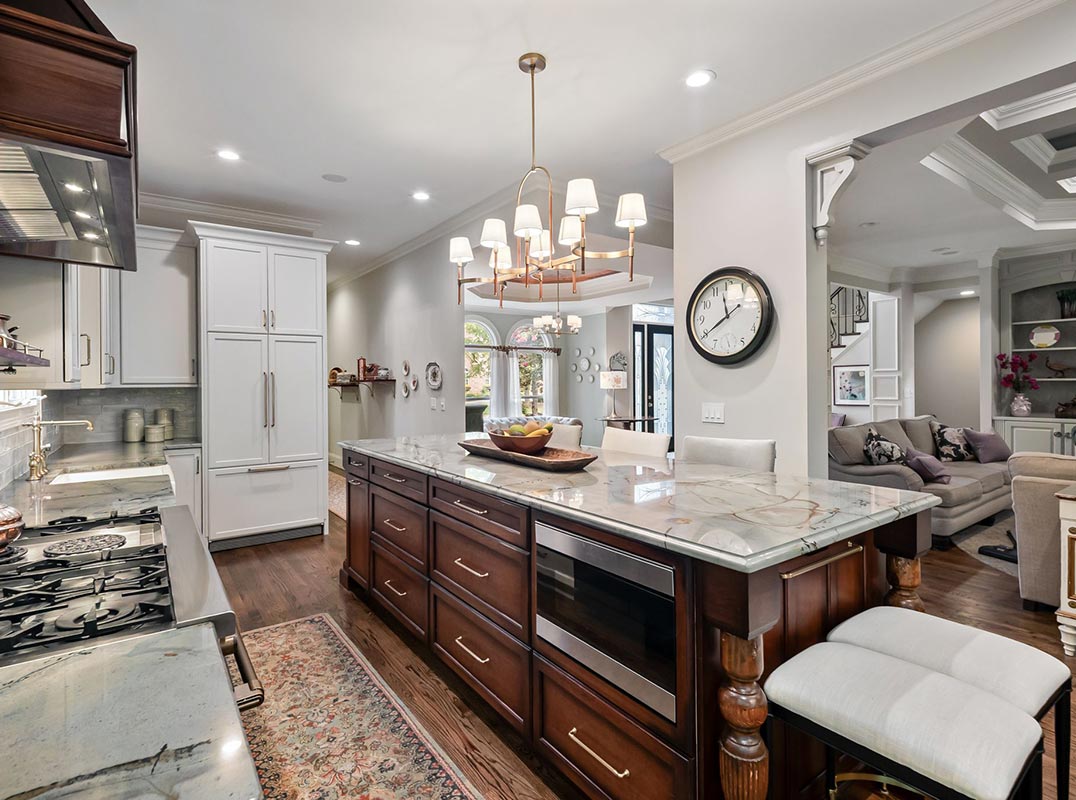 The space is framed by oversized aquarium-style windows that capture wooded views and flood the home with natural light. Ten-foot ceilings throughout add a grand sense of scale, while designer lighting, intricate millwork, and wide-plank hardwoods complete the aesthetic. The kitchen flows seamlessly into a spacious dining area and great room, anchored by a fireplace, creating a warm yet elegant environment for both everyday living and entertaining.
