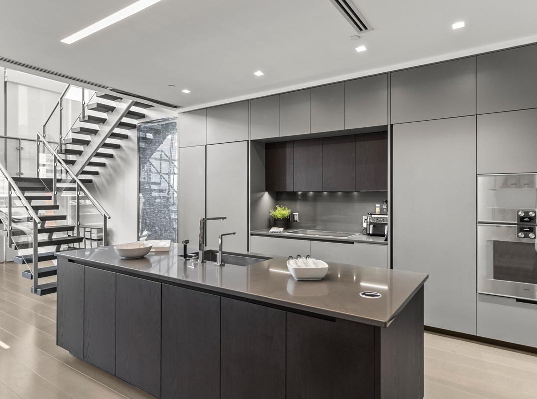 The chefs kitchen is a masterpiece custom-designed by Poliform, Italys premier luxury cabinetry brand featuring sleek, handle-free surfaces, integrated appliances, a built-in coffee station, and minimalist finishes that define modern elegance. Culinary enthusiasts will appreciate the Gaggenau appliance suite, celebrated for its precision engineering and sleek aesthetic, seamlessly integrated into Poliform custom cabinetry. Rich stone surfaces set against crisp lines and muted tones. Upstairs, the private quarters unfold with equal luxury and flexibility. A refined kitchenette or bar area supports the vision of a second living suite, guest retreat, or intimate lounge. This level flows seamlessly to a spectacular rooftop terrace, one of the homes most captivating features.
