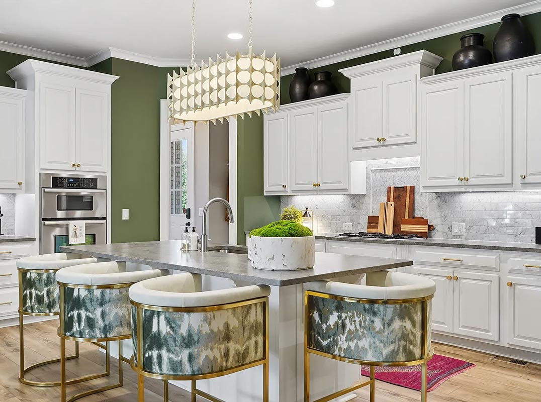 Step into this PROFESSIONALLY decorated 5-bedroom, 4-bathroom home. The main level features a GUEST BEDROOM and FULL BATHROOM an office, and beautiful formal dining room boasting high-end lighting fixtures. The grand kitchen impresses with an OVERSIZED ISLAND, gas cooktop, wine bar, built-in ovens, quartz countertops and a seamless flow to the sophisticated GREAT-ROOM and SITTING AREA.