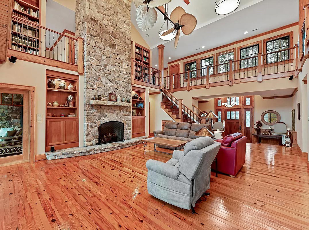 Throughout the home, you’ll find over 30 custom, hand-crafted cherry wood interior doors, built by renowned builder Pete Zagaroly, a rare and striking detail that elevates the home’s quality. The flooring is equally impressive, featuring reclaimed heartwood pine sourced from the historic Cannon Mills factory, offering rich character and durability.