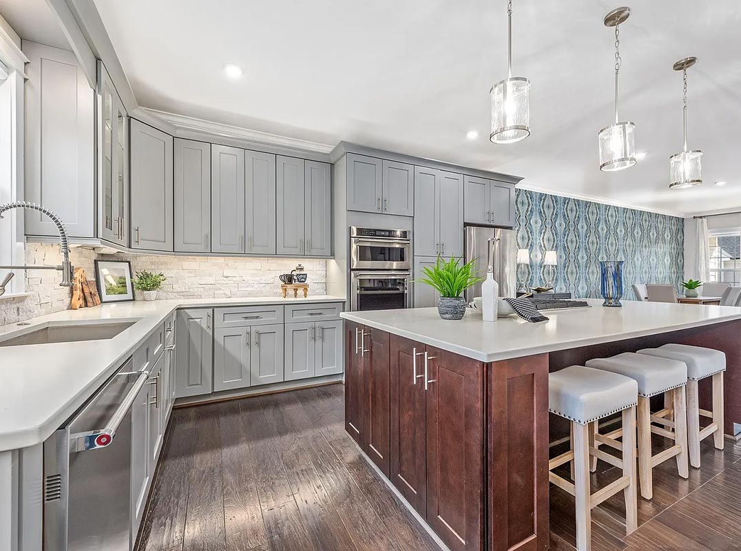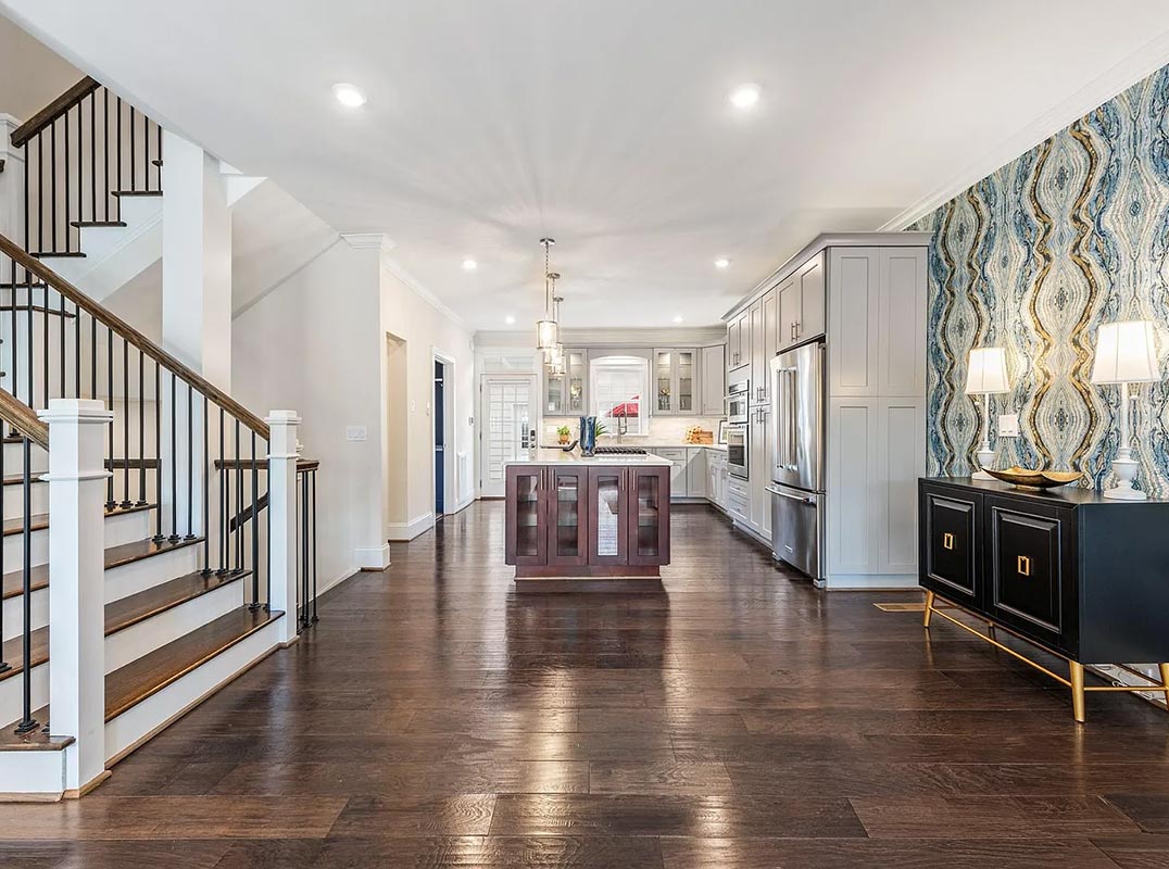 Above, the main living level—conveniently accessed from both the back patio and the detached two-car garage—reveals a grand open-concept design that effortlessly connects the kitchen, dining, and living spaces. Rich wood flooring, curated finishes, and custom built-ins enhance the refined atmosphere. The chef’s kitchen is appointed with island seating, a gas cooktop, convection oven, beverage and wine refrigeration, and ample cabinetry—perfectly suited for both everyday living and elegant gatherings.