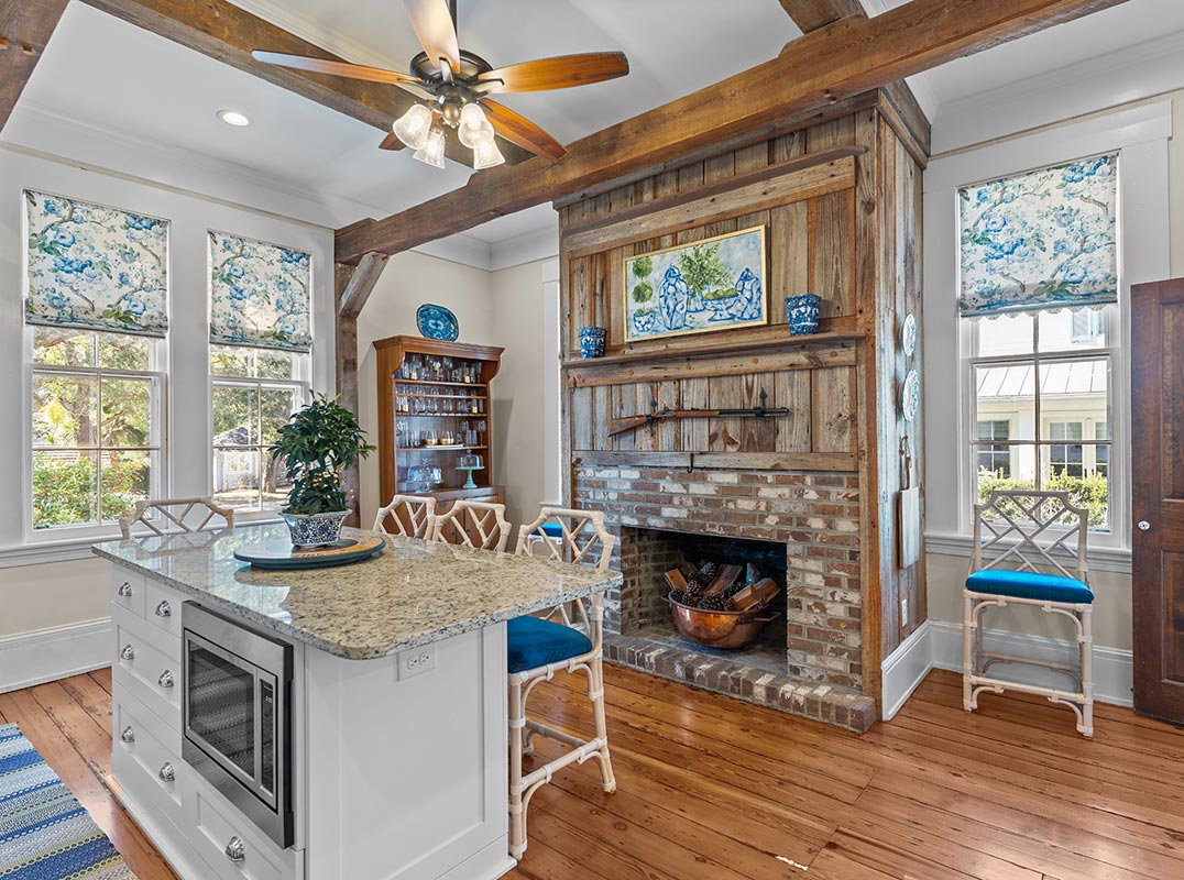 Spanning approximately 6,025 SF across three finished levels, including a 1,645 SF finished lower level, the residence features 6 bedrooms and 5.5 baths with heart pine floors, intricate moldings, signature Southport bow detailing, and soaring ceilings that enhance natural light throughout.