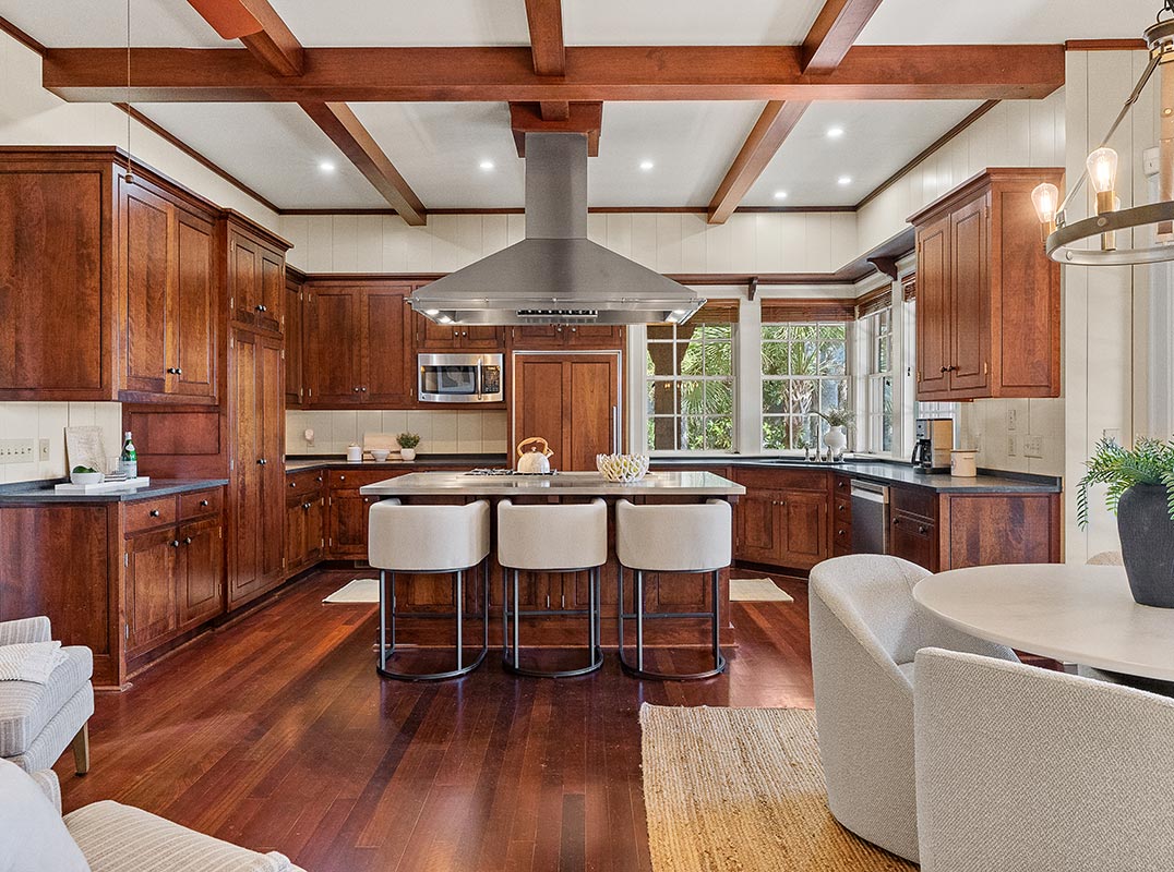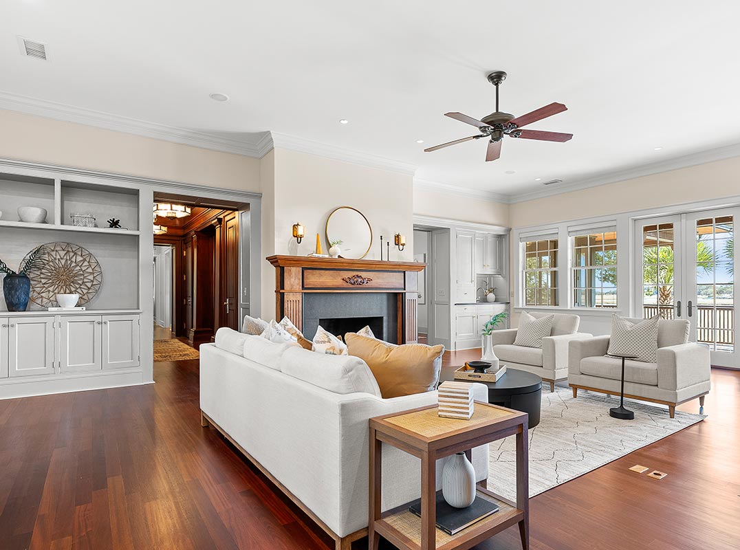 The second floor is dedicated to tranquil sleeping quarters. The primary suite, adorned with mahogany paneling, features a sitting room, beverage center, large walk-in closet, spa-like en-suite bath with steam shower, private balcony, and sweeping views of the marsh and Bass Creek. Two additional bedrooms on this level each offer en-suite baths, with one featuring a sitting room and the other a balcony and loft area. The fourth bedroom is located within the guest cottage. Throughout the home, Brazilian cherry flooring, board-on-board paneling in baths, and kitchen, and thoughtfully executed architectural details reflect exceptional quality and timeless design.