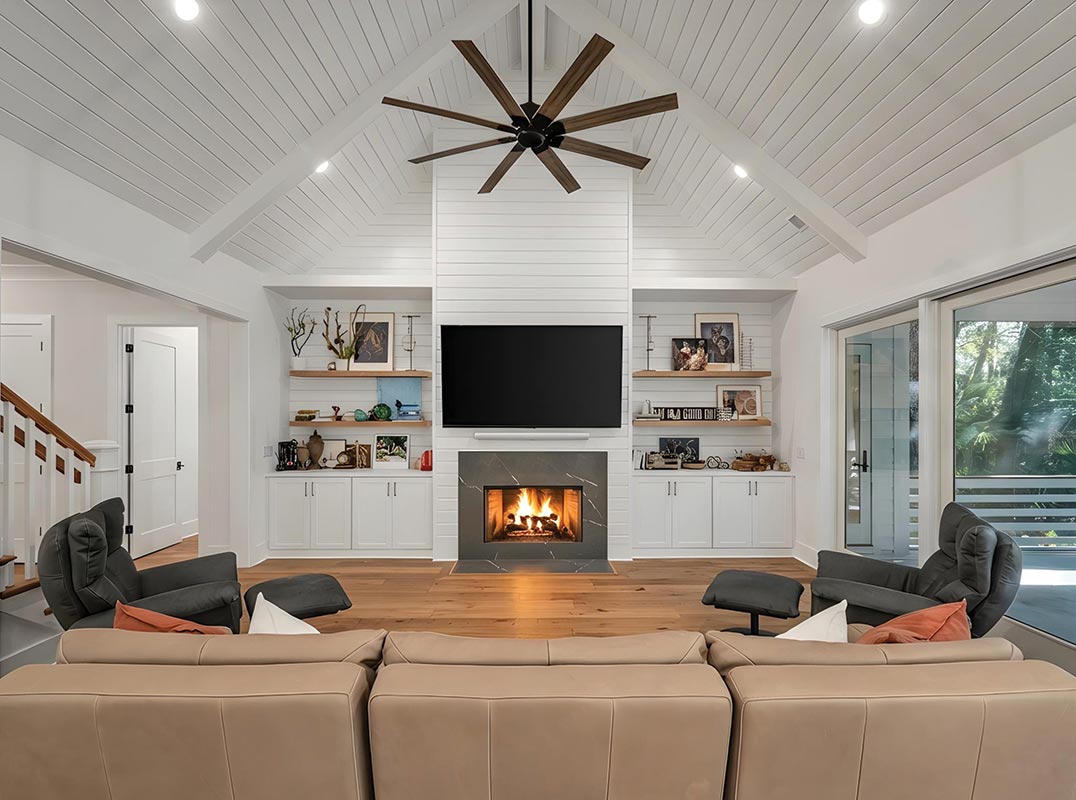 Upstairs, four additional bedrooms, three full baths, and a flexible bonus or office space provide privacy and versatility for guests, work, or extended stays.The open, light-filled living space centers around a vaulted living room with a shiplap ceiling and gas-log fireplace, creating architectural interest without excess, while wide-plank hardwood flooring adds warmth throughout. Designed for everyday living and entertaining, the interior flows seamlessly to the large screened porch area overlooking the lagoon. The kitchen is both intentional and refined, featuring Thermador and Wolf appliances, including a six-burner gas range with pot filler and hood, Thermador refrigerator and dishwasher, Wolf microwave and toaster oven, and two wine and beverage refrigerators along with a walk-in pantry. A dedicated bar area allows for easy entertaining without interrupting the flow of the home.