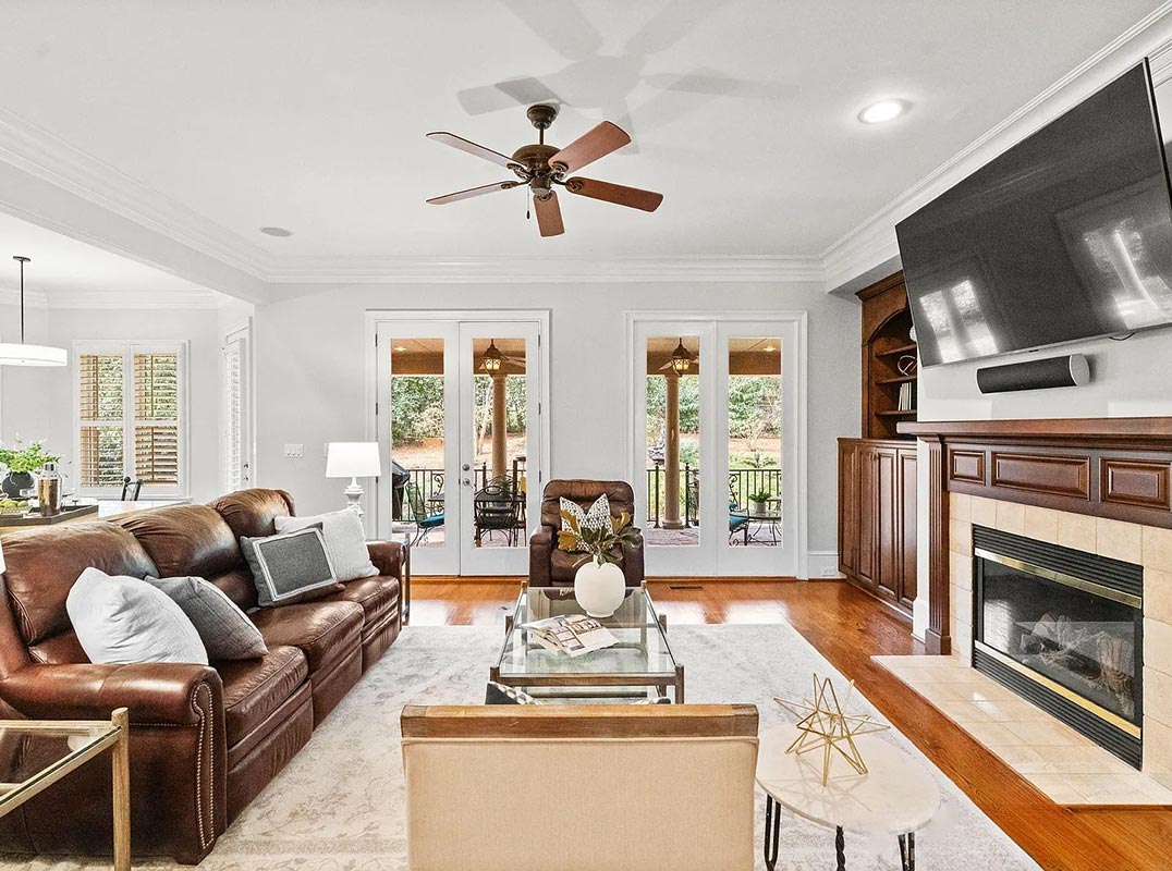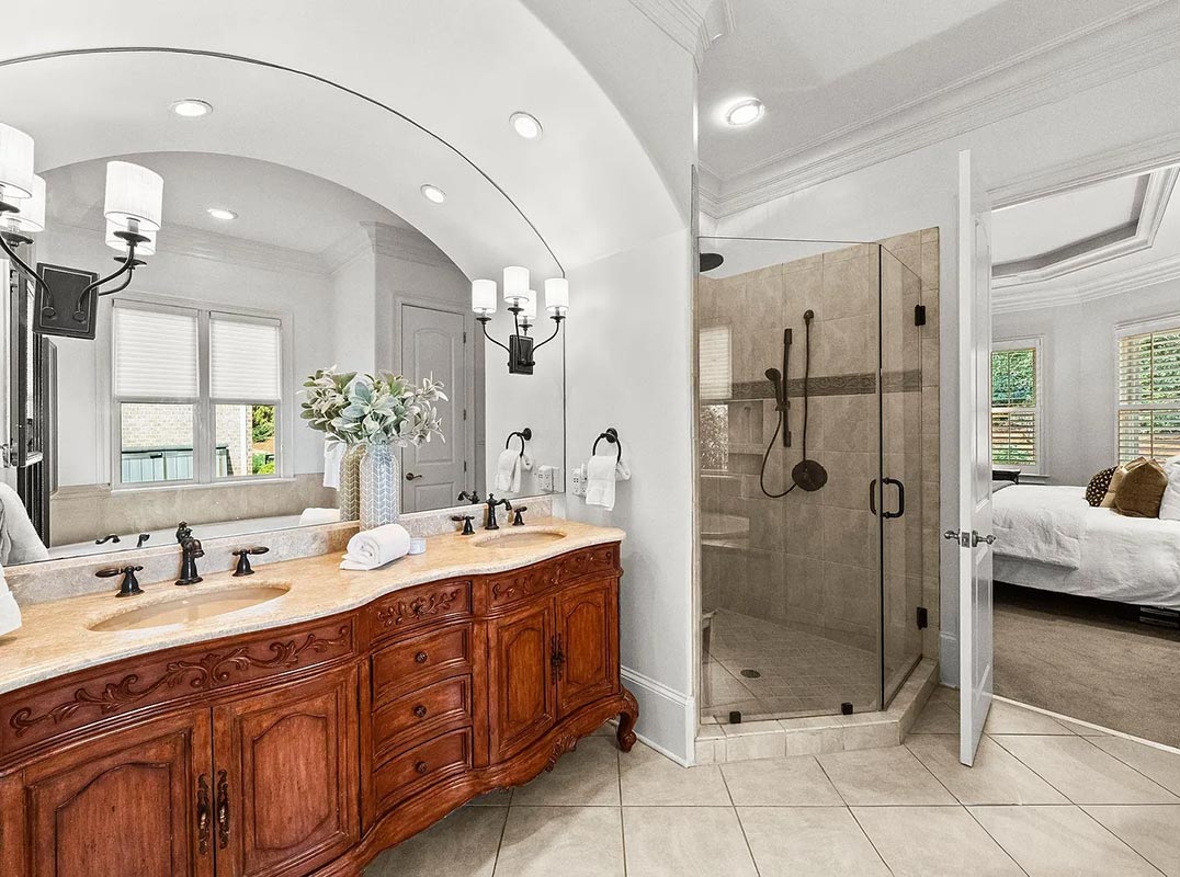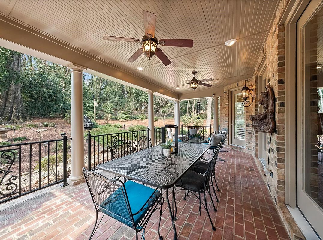 Stunning full-brick home showcasing exceptional craftsmanship and timeless architectural detail throughout. The main level features soaring 10-foot ceilings, extensive crown molding, extra-tall baseboards, and elegant arched doorways with rounded corners. A custom mahogany front door creates a grand first impression, while upgraded garage doors with architectural overhang add to the home’s curb appeal.