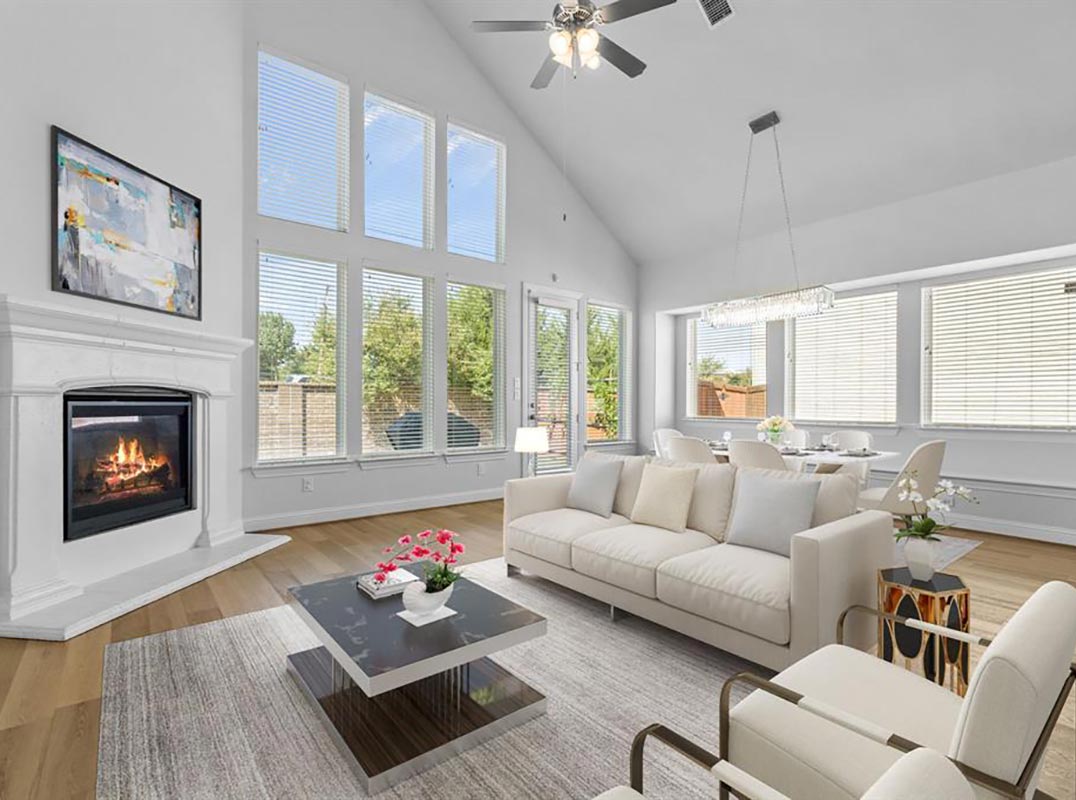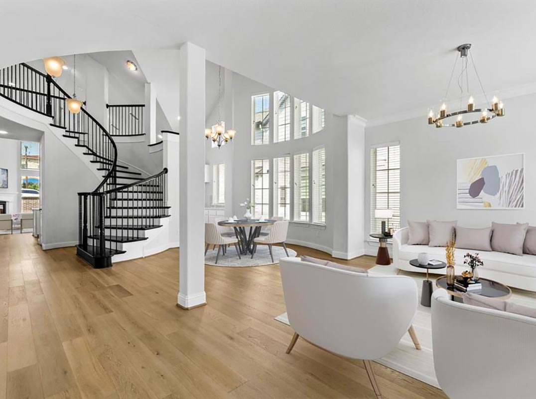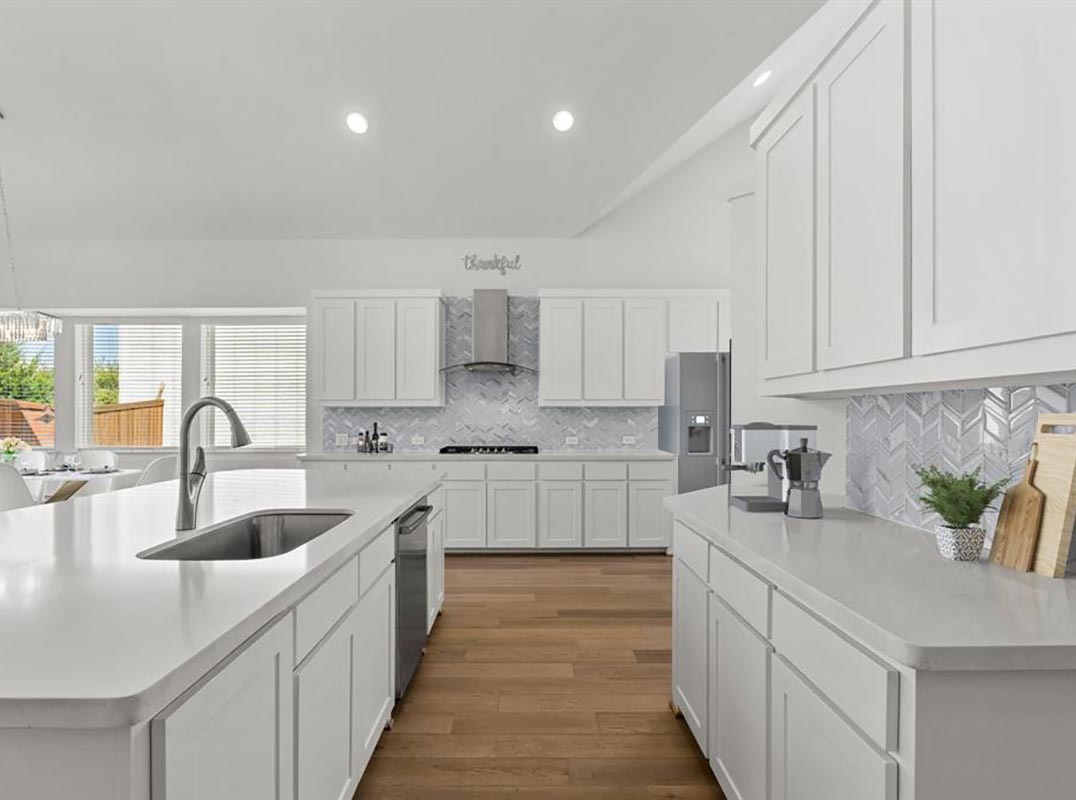 Welcome to 5621 Snowberry Drive, nestled in Plano’s prestigious Heritage Ridge Estates! Feeds to Plano ISD schools. This Grand Martinique residence blends timeless architecture with a crisp, modern aesthetic, offering a lifestyle of comfort, sophistication, and convenience. The exterior showcases a stunning white brick façade accented by refined stone landscaping, creating curb appeal that is both elegant and contemporary. Inside, soaring two-story ceilings and walls of windows bathe the home in natural light, drawing attention to the wide-plank blonde hardwood flooring that flows seamlessly across the main level. A sweeping curved staircase becomes the centerpiece of the living and dining areas, adding architectural drama and a sense of grandeur. At the heart of the home, the chef’s kitchen is a showpiece of design and function, featuring quartz countertops, sleek white cabinetry, a striking glass-and-marble backsplash, and a gas cooktop with vented hood. Modern lighting and designer fixtures complete the space, making it as inviting for everyday living as it is for entertaining.