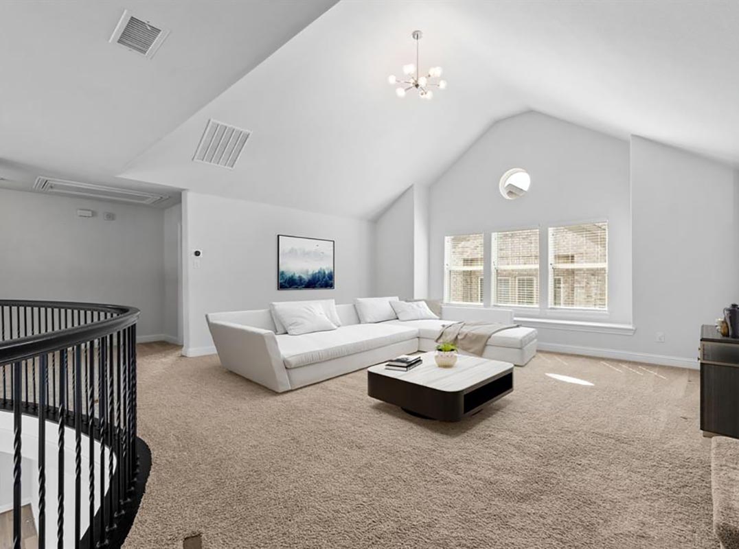 The private primary suite offers vaulted ceilings and a spa-inspired bath with dual vanities, soaking tub, frameless walk-in shower, and luxe quartz surfaces. A secondary bedroom with full bath on the first floor provides versatility for guests or a home office, while the absence of carpet downstairs keeps the aesthetic fresh, clean, and low-maintenance. Upstairs, a spacious game room with lofty ceilings overlooks the main floor, creating a vibrant space for gatherings. Three additional bedrooms and two full baths ensure ample comfort and privacy for family or guests. Perfectly situated just minutes from premier shopping, dining, and major highways, this home delivers modern elegance, thoughtful design, and everyday ease in one of Plano’s most desirable communities.