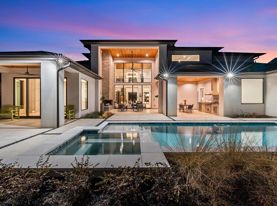 Discover an exquisite masterpiece of contemporary luxury and sophisticated design, nestled in the heart of Frisco, Texas. Enter through grand modern iron French doors into a breathtaking two-story foyer, an architectural marvel of elegance and tranquility. The vestibule leads to the refined dining room, seamlessly connected to a chic wet bar and a convenient butler’s pantry, perfect for both intimate dinners and grand celebrations. Step beyond the vestibule and wet bar to the expansive family room, where a striking transitional-modern fireplace highlighted by custom designer tile and dry-stack stone detailing, centered around an elegant linear gas fireplace creates a warm and inviting focal point. This space flows effortlessly into the gourmet kitchen and informal dining area, a true chef's delight with high-end appliances and elegant finishes, ideal for family gatherings and entertaining.
