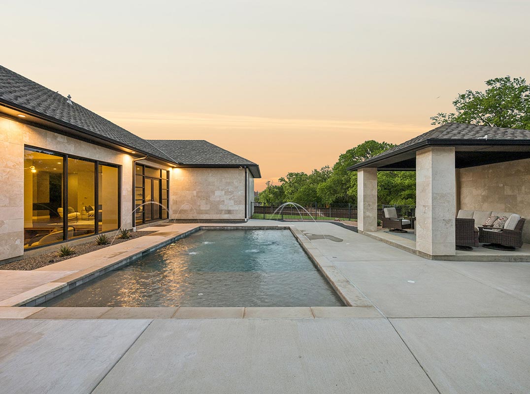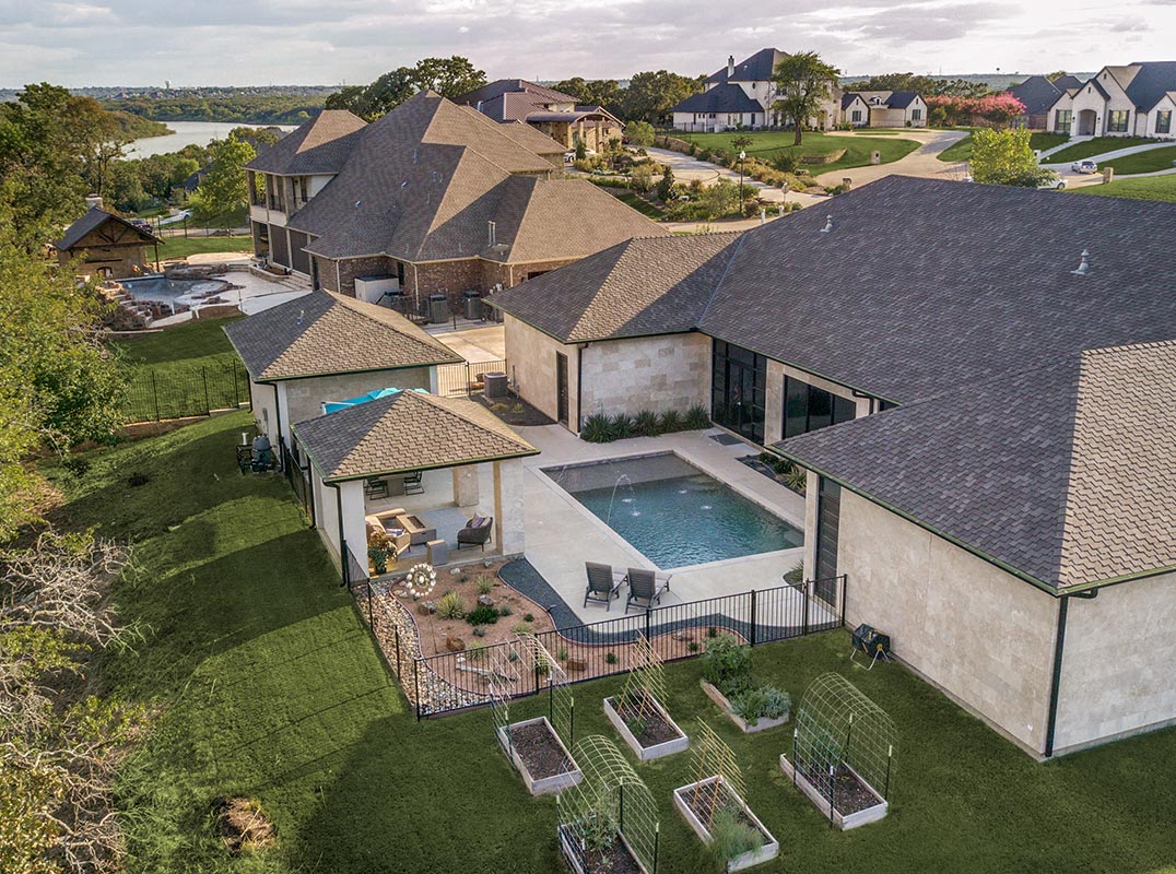 Surround yourself in modern elegance in this contemporary single-story home located in the Bluffs at Pinnell Pointe near Lake Lewisville. Designed with an open-concept layout, this unique home offers seamless flow, abundant natural light, and a clean, transitional feel that appeals to today’s buyers. The thoughtfully designed floor plan features a chef-inspired kitchen with commercial-grade appliances, ideal for both everyday living and entertaining. Multiple living areas provide flexibility and capture serene views, while four spacious bedrooms, a dedicated study, and an additional study nook with built-in bookshelves create functional spaces for work and relaxation. A versatile game or flex room adds even more adaptability, and the commercial-grade doors and windows add an elevated feel. The oversized garage includes opaque doors and an electric vehicle charger. High-end finishes include Travertine exterior, rich wood flooring throughout, foam insulation for energy efficiency, pocket doors, and low-maintenance Xeriscape landscaping. Step outside to a private backyard retreat complete with a resort-style pool featuring deck jets, an outdoor kitchen, cabana, pool bath with shower, separate storage with an overhead door, and plenty of yard. Located near Lake Lewisville, this home offers a rare combination of modern design, functional living space, and outdoor lifestyle appeal in one of the area’s most desirable communities. The rolling hills terrain and trees add charm to the lake community. Easy access to shopping, dining, I35, and other conveniences. No HOA, MUD or PID.