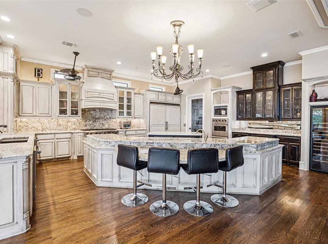 This lavish retreat features a cozy sitting area w-a see-through FP, dual spa-inspired bathrooms, heated floors, a wet bar, 2 large WIC's + a connected fitness room. A steam shower, safe room & private laundry area complete the suite’s luxurious amenities. Gourmet kitchen is a culinary masterpiece, fully equipped w-top-of-the-line Viking Apps including a 6-burner gas cooktop, double ovens, full-size BI wine fridge, two dishwashers + a spacious island w-a trough sink & foot-pedal-controlled faucet. Lighted cabinetry, pantry & a BI fridge elevate both style & function. A secondary suite w-its own kitchen + full bath provides ideal accommodations for guests. Upstairs, 3 additional bedrooms accompany a large game rm, media rm + private office—each offering access to balconies overlooking the lake. Step outside & relax in the infinity-edge pool, cook up a feast in the outdoor kitchen, unwind by the fire pit, or rinse off in the outdoor shower. The covered patio is enhanced w-retractable shades for all-season comfort & a boat dock trolley offers easy lake access. There’s even a dedicated dog run. Smart home is loaded with high-end features including Control4 automation, foam insulation, water filtration system + abundant storage. Car enthusiasts will appreciate the three 2-car garages—including one located beneath the main garage w-internal access. Enjoy unrivaled lakeside lifestyle.