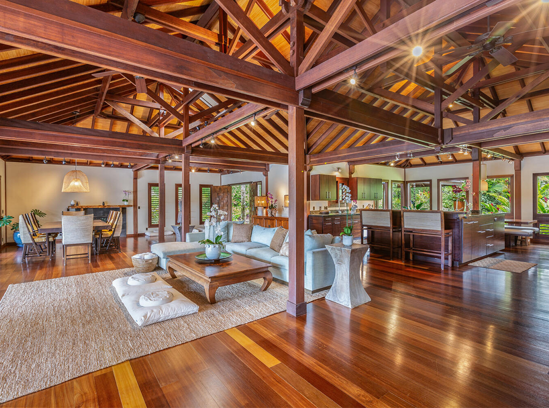 This secluded 3.5-acre estate offers Bali-style luxury with breathtaking Mt. Namahana views. The 4,502 sqft main residence features 4 bedrooms, 3.5 baths, and a grand 1,750 sqft great room. The outdoor living spaces, including an infinity-edged saltwater pool and spa, are perfect for entertaining. The property also includes a gym, oversized garage, air conditioning, and a writer’s cottage. Enjoy world-class golf, pristine beaches, and surf spots nearby. This is one of the finest properties on Kauai’s North Shore.
